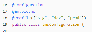 比如我这篇文章结合使用Springboot JMS 与 Amazon SQS 标准队列 写的JmsConfiguration。当我们启动项目的时候,这个JMS会自动启动监听器了,而这个JMS又依赖服务器上的特有权限 比如访问资源,那么当我们本地没有权限时执行unit-test的话就不能正常启动了。这个时候加上注解@Profile({"stg", "dev", "prod"}) 就可以很好地解决问题了,如图: