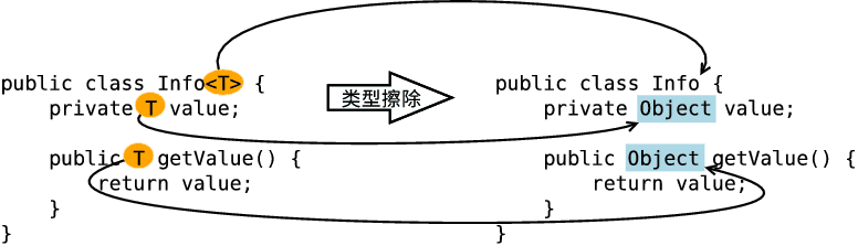 当类定义中的类型参数没有任何限制时,在类型擦除中直接被替换为Object,比如<T>和<?>的类型参数都被替换为Object。