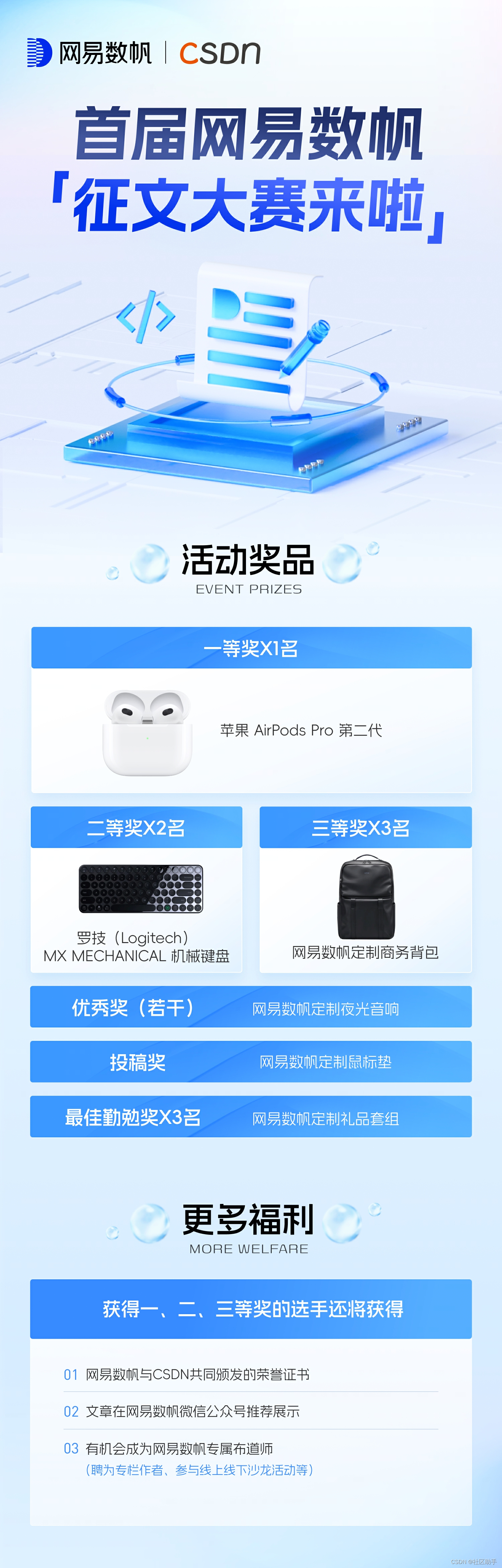 作者在投稿后,优快云评审组将进行初审,过审文章每周一公布更新公布征文最新情况,并转载至 优快云 社区“网易数帆” 专栏和网易数帆CodeWave开发者社区上,通过初审的作者获得网易数帆定制礼品一份。