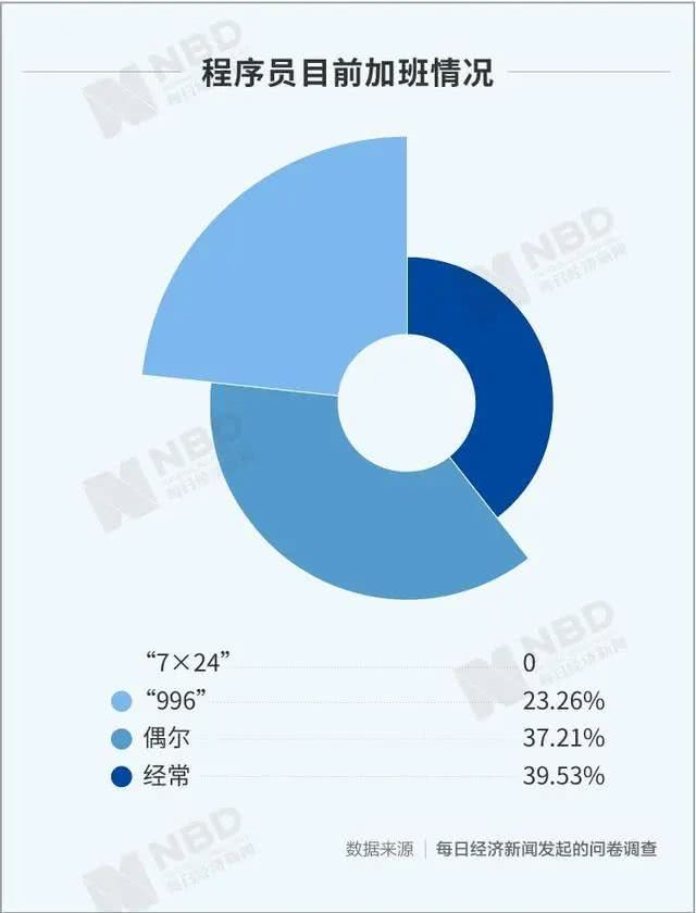 此外,加班可能也是程序员们考虑大龄转型的原因。《每日经济新闻》记者收集的问卷调查显示,39.53%的程序员目前经常加班,23.26%的程序员“996”。
