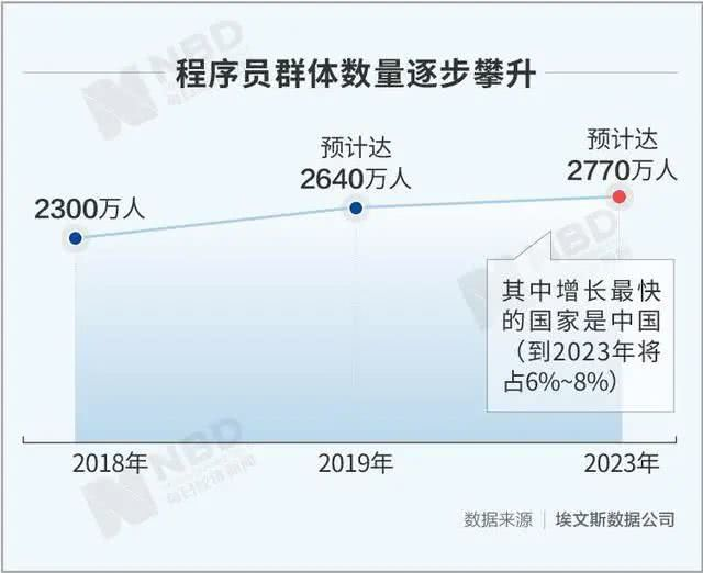 程序员的群体数量也在攀升。仅软件开发人员,全球市场存量就达到了千万量级,而且一直处于增长态势。根据埃文斯数据公司2019年的统计数据,2018年全球共有2300万软件开发人员,预计到2019年底,该数字将达到2640万,而到了2023年或将达到2770万,其中增长最快的国家是中国(到2023年将占6%~8%)。