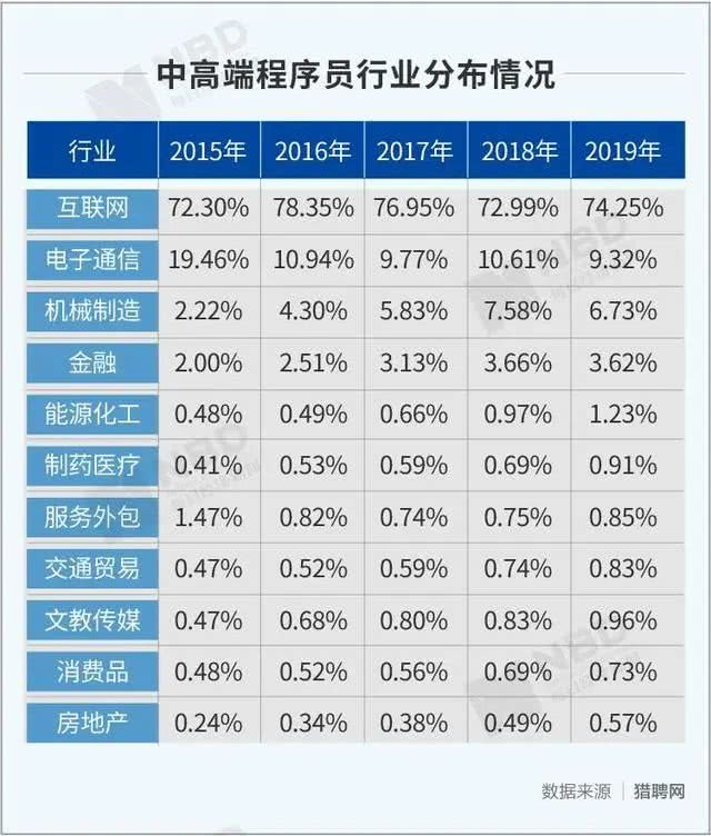 猎聘网数据显示,中高端程序员主要分布在互联网行业。