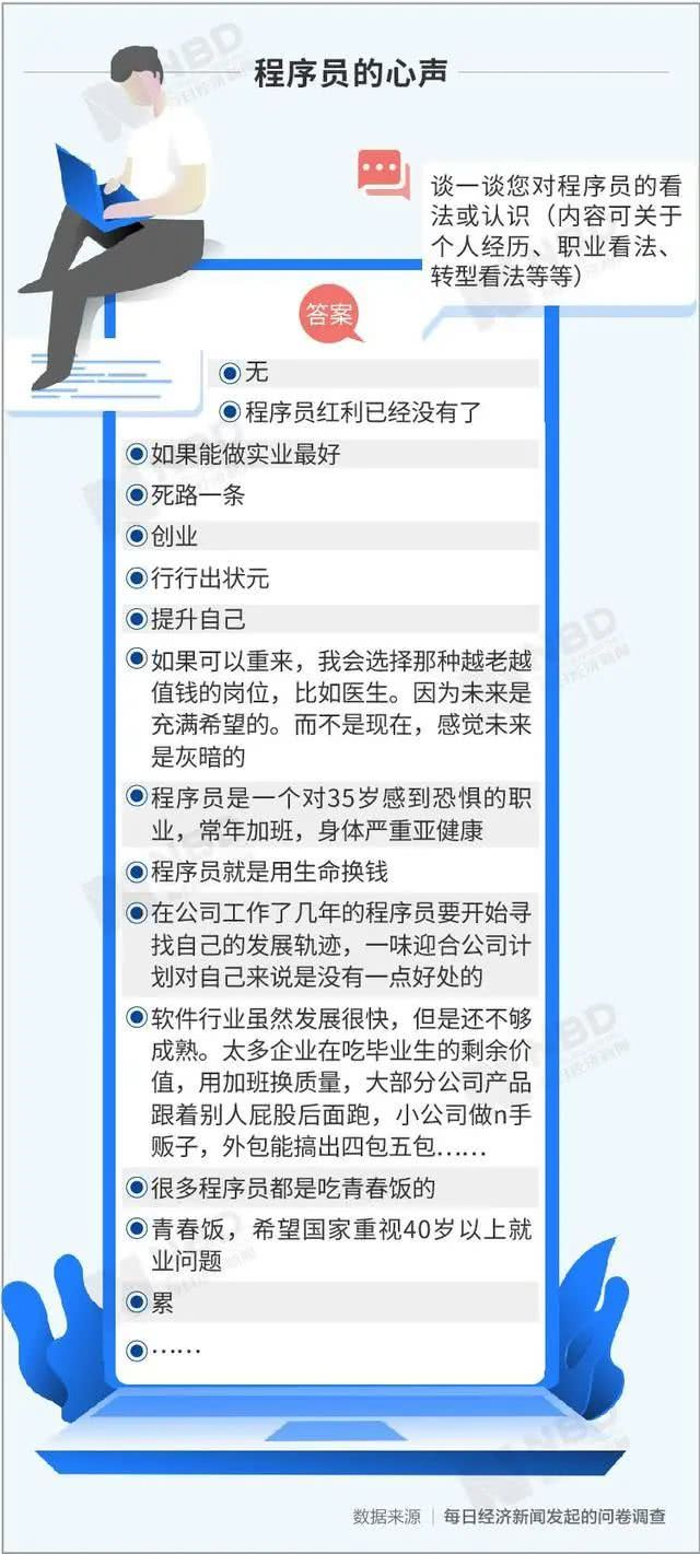 在《每日经济新闻》记者收集到的问卷调查中,多数程序员都表示,程序员这一行就是吃青春饭。有人还评论道:“程序员,一个对35岁感到恐惧的职业,常年加班,身体严重亚健康。”
