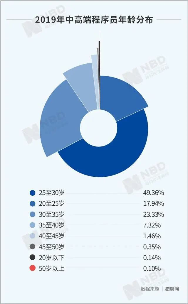 同时,这个职业的从业者的确正在越发年轻化。猎聘网数据显示,哪怕在中高端程序员群体中,也是25~30岁的程序员占比最大。