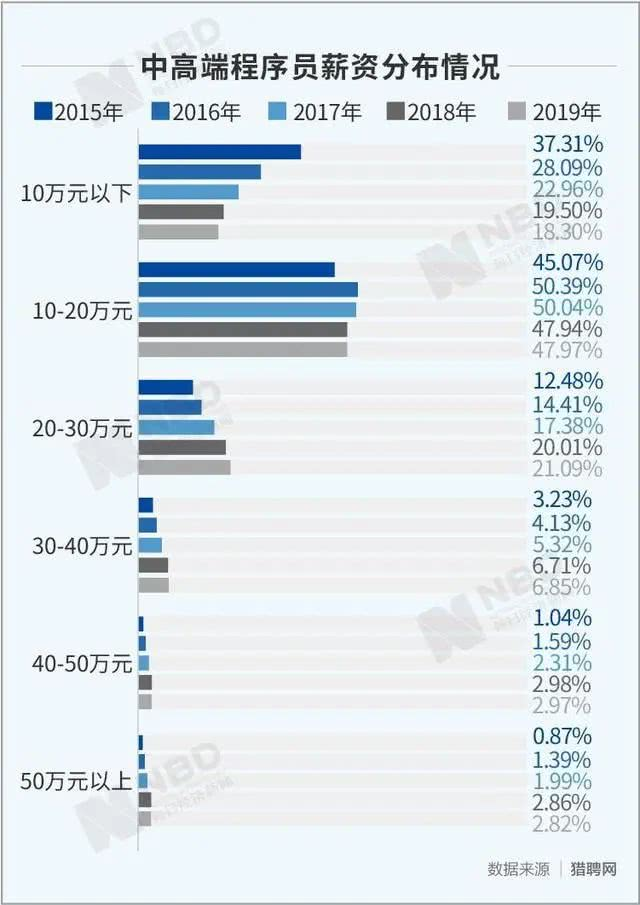 数据显示,近半数中高端程序员薪资分布在10万~20万元。不过,通过数据也可以看到,近年来,年薪位于20万元以上的中高端程序员占比也在不断扩大。