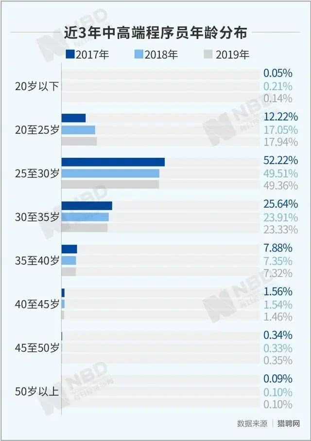 此外,近3年来,20~25岁年龄段的中高端程序员占比也在逐渐扩大。