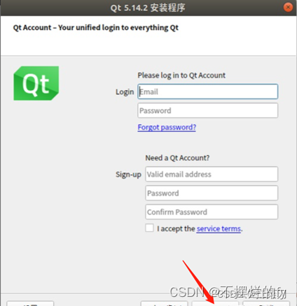 看到下图所示界面时,需要Qt账号,需要注册一个,注意密码的要求。(然后你需要验证,验证的过程按照他要求的填,看不懂的话就翻译一下,第一次没看明白就填,也不知道是哪里填错了导致注册不成功,这里我们重新下载了三次。)
