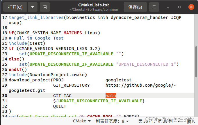 **若在执行cmake命令遇到报错,打开Cheetah-Software文件下的common文件夹下的CmakeLists.txt文件,修改master为main,保存后退出,重新执行cmake。