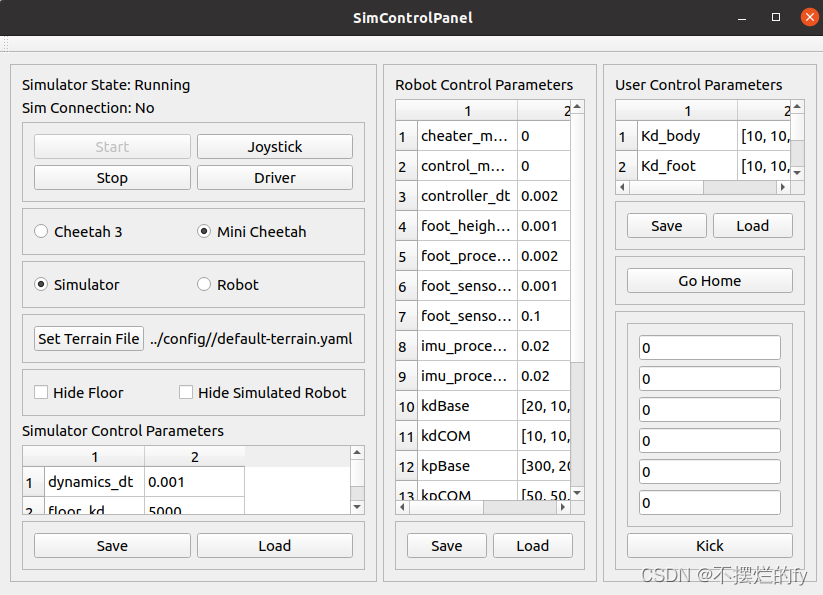 - 依次点击1. Mini Cheetah 2. Simulator 3. Start
