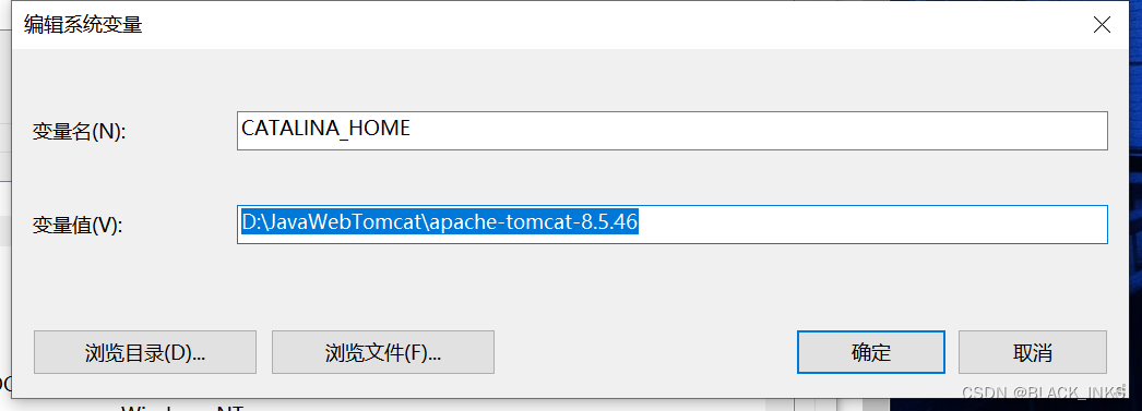 变量值: D:\JavaWebTomcat\apache-tomcat-8.5.46 (根据你自己安装的地址填写,复制地址即可)