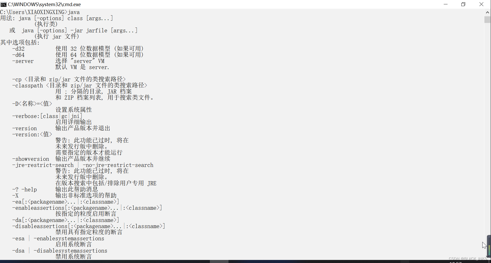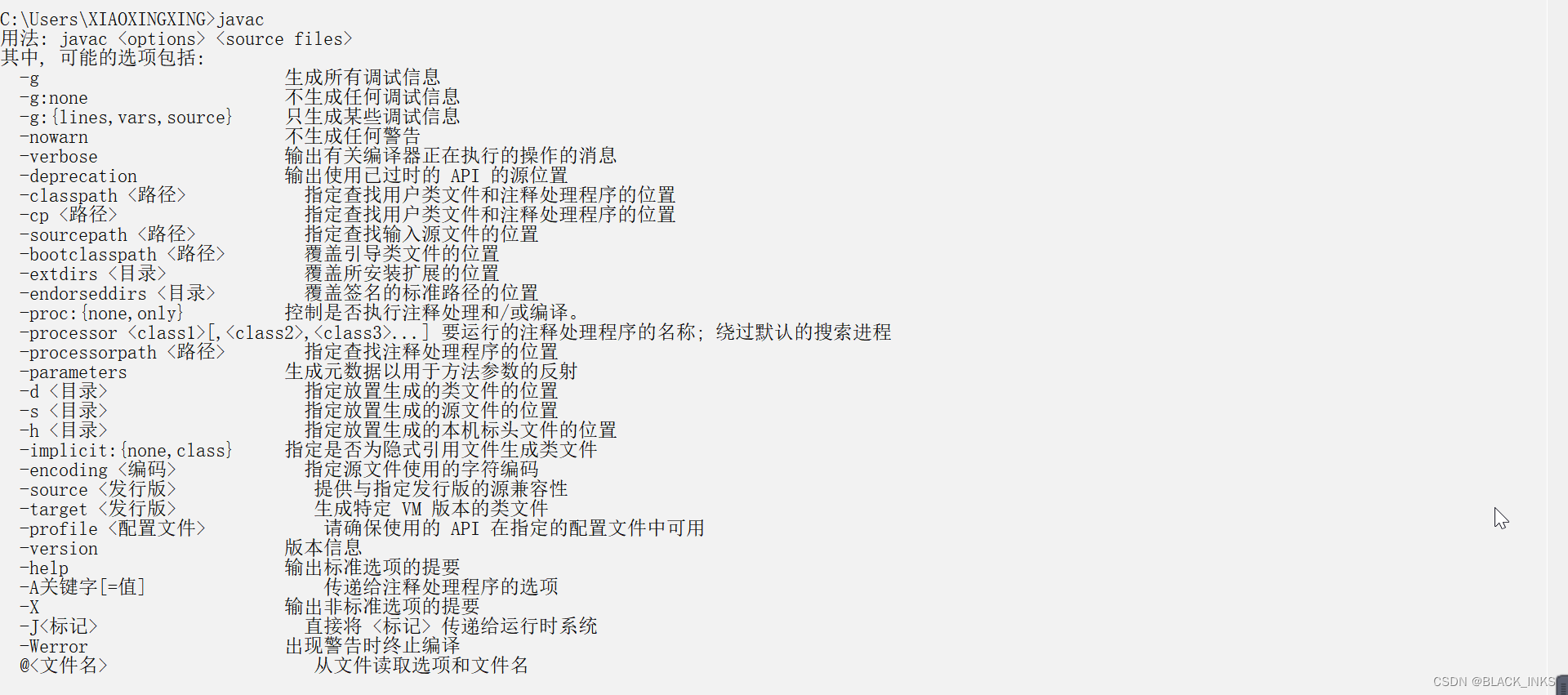 分别输入javac 和java命令,会显示以下内容,则表明java环境搭建成功。