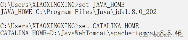分别输入set JAVA_HOME 和set CATALINA_HOME命令,如果能找到,说明配置成功。