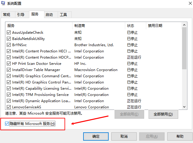 2、在“服务”选项卡中,勾选“隐藏所有Microsoft服务”,避免误关系统关键服务。
