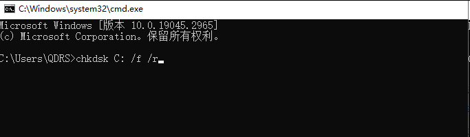 1、打开命令提示符(CMD),输入 chkdsk C: /f /r,按下回车执行磁盘检测与修复。
