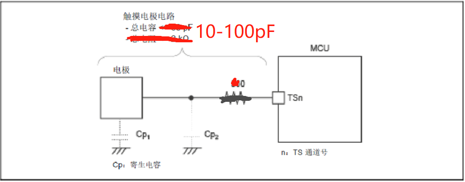 图2-1所示为自电容式电极电路。该触摸按键电路配置由触摸电极和电极导线构成。请注意,触摸按键电路C也受电路板周围物体(例如GND图案、覆盖面板和主体外壳)的寄生电容的影响。使用上述设计值以外的值时,可能无法获得正常的测量值。