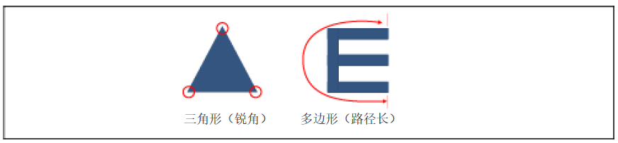 图2-3所示为不建议采用的电极形状-直角或锐角三角形和线宽较窄且总长度较长的E形。这些形状容易产生天线效应,并会降低射频抗噪性能,因此不建议使用。