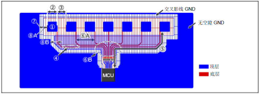 本文提供的信息可供在双面印刷电路板上设计自电容式按键时进行参考。我们建议使用2层及以上的电路板,并在电极周围放置具有交叉影线GND图案的屏蔽保护,抑制由于周围环境和噪声因素引起的寄生电容波动。