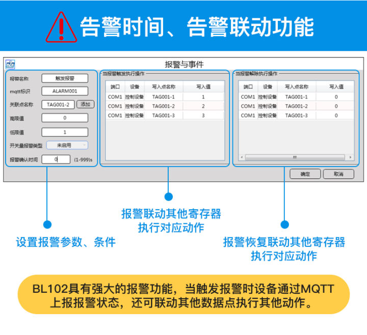 同时,钡铼技术MQTT网关BL101还支持设置告警联动触发功能,可满足工业现场多种应用。