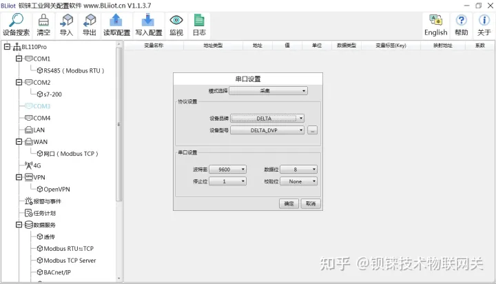 本文介绍如何配置台达PLC网关BL110连接Delta_DVP系列PLC,并接入ModbusTCPServer云平台的过程。主要内容包括COM口设置、设备及数据点添加、ModbusTCPServer配置及数据验证。