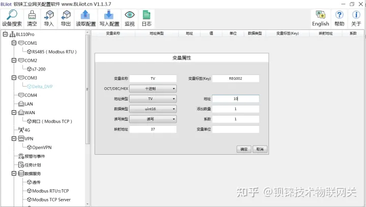 (1)点击“ 台达 PLC Delta_DVP ”,鼠标光标移动到方框内,鼠标右键,点击“添加”弹出数据点设置框。(2)变量名称:命名数据点的名字,如:采集“Tv10”的数据,可以填写为:Tv10。(3)变量单位:根据需求任意填写,可以不填写。(4)地址类型:根据采集的PLC的数据点选择。如:要采集“Tv10”的数据则选择“Tv”。(5)起始地址:采集数据点的寄存器地址,如:采集“Tv10”的数据,地址为:10。(6)数据类型:根据选择采集PLC的寄存器的类型选择。(7)添加数量:如果是采集连续地址,同一寄存器可以多个采集。(8)读写类型:从“只读”、“可读可写”中选择。(9)系数:扩大或缩小多少倍上传给平台,根据需求填写。(10)modbus映射地址:填写采集到的数据点存储到BL110网关设备的地址,可以随意填写。映射地址不能重复。范围:0-2000。如:采集“Tv10”的映射地址为“10”。(11)数据点的MQTT标识符,可以任意填写。标识符不能重复,如:采集“Tv10”数据点的MQTT标识填写为“Tv10”。(12)点击“确定”。