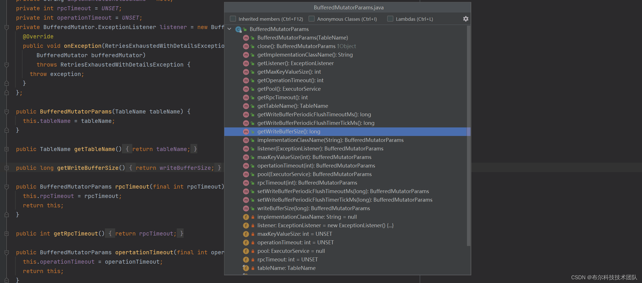 主要参数TableName(表名),writeBufferSize(写缓存大小),maxKeyValueSize(最大key-value大小),ExecutorService(执行线程池),ExceptionListener(监听BufferedMutator的异常)。