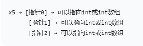 x5存储的是malloc返回的内存块的起始地址,这个内存块包含3个连续的int*指针位置