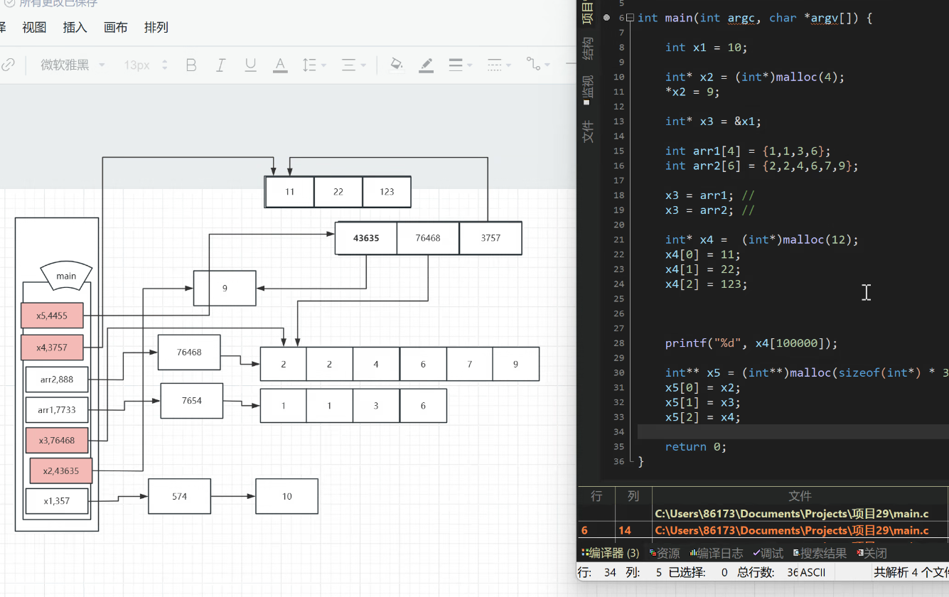 图中int* x2=(int*)malloc(4);//此处写成malloc(sizeof(int))更为标准,这里为了方便区分括号里的内容。