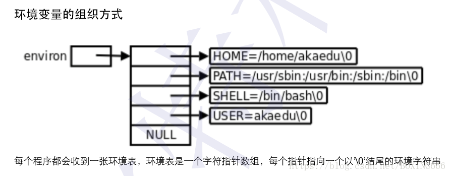 注意:libc中定义的全局变量environ指向环境变量表,environ没有包含在任何头文件中,所以要用extern声明