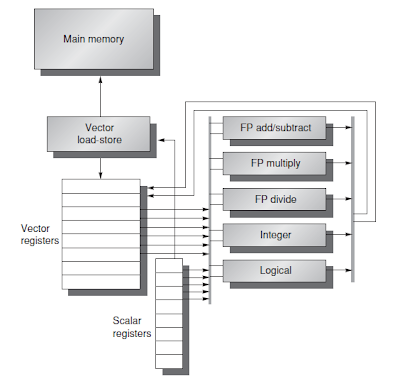 一个向量处理器通常由一个普通的流水化的标量单元加上一个向量单元组成。在这个向量单元里的所有功能部件都有几个时钟周期的延迟。这使得能够使用较短的时钟周期,并且与复杂的需要深度流水化来避免数据 hazard 的向量运算兼容。大多数的向量处理器所允许的向量运算包括浮点运算,整型运算或者逻辑运算。这里我们重点关注浮点运算。标量单元基本上和我们在第二章和第三章里面讨论过的高级的流水线化的 CPU 里面的没区别。并且实际上商用的向量处理器里面都同时包含了乱序的标量单元(NEC SX/5)和 VLIW 的标量单元