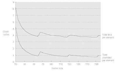 至于究竟是使用 scatter-gather 的版本更好还是使用条件执行的版本更好取决于该条件测试满足的频率以及这些操作的开销。不考虑 chaining 的话,第一个版本(前一小节)的耗时是 5n + c1。第二个版本,也即采用每一个周期能执行对于一个元素索引化 L/S 的版本,的执行时间是4n + 4fn + c2 [2],其中 f 是条件测试满足(也即A(i) != 0)的比率。如果我们假设 c1 和 c2 差不多,或者说他们都远小于 n,我们可以求出什么时候第二个版本会更好。