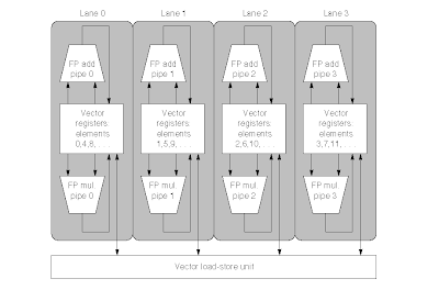 每一个 lane 包含了向量寄存器文件的一部分以及每个向量功能单元中的一条流水线。每个向量功能单元通过多个流水线(每个 lane 一个)以每个周期一个element group 的速率来执行向量指令。第一个 lane 包含有所有向量寄存器的第一个元素,因此任何有关第一个元素的向量指令的源操作数和目的操作数都在第一个 lane 中。这使得一个算术运算的流水线的操作能在一个 lane 内部完成而不需要和其他 lane 通信。Lane 间互联只是在访存的时候才需要。缺少 lane 间通信能够降低互联导线开销和用于高度并行执行单元的寄存器文件的端口,并且解释了为什么当前的超级计算机可以在每个周期完成至多 64 个操作(16 个lane,每个有 2 个算术单元和 2 个 L/S 单元)。