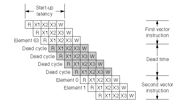 下面的例子展示了死时间对于向量处理器性能的影响。