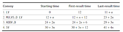 (忽略任何向量指令发射开销)[3]。注意虽然我们允许 MULVS.D 和 LV 在convoy 2 中同时执行,大多数的向量机器需要2 个时钟周期去触发(initiate)这两条指令。