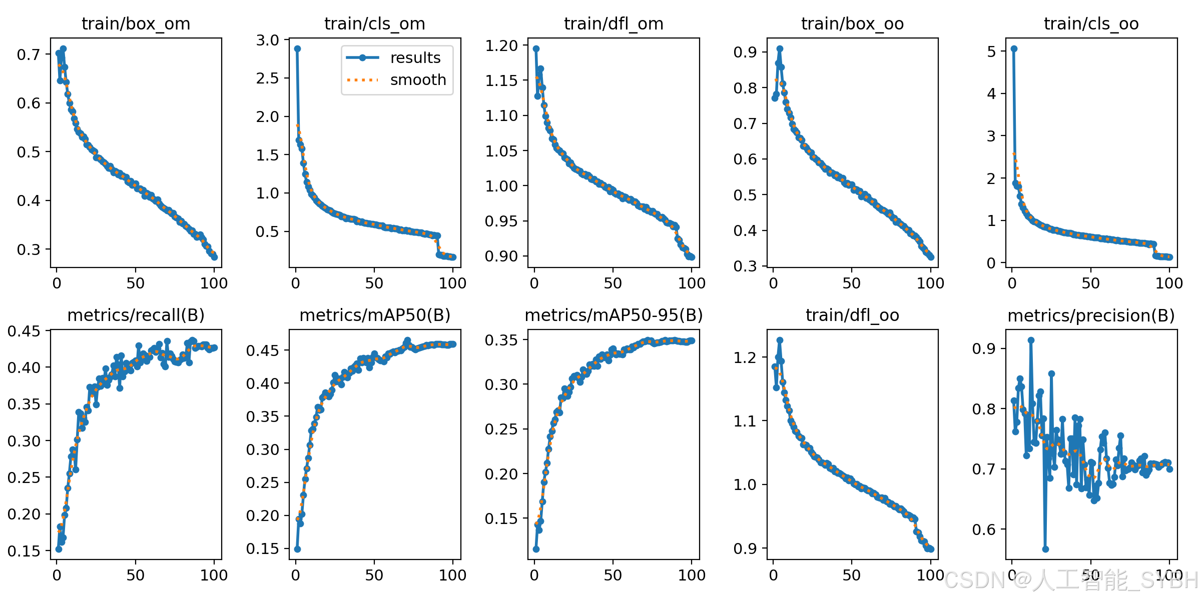 在性能指标方面,图表中的metrics/precision、metrics/recall、metrics/mAP50和metrics/mAP50-95展示了模型性能的逐步提升。随着训练迭代的增加,准确率(Precision)和召回率(Recall)不断提高,这表明模型在识别正样本时变得更加精确,且能捕捉到更多的正样本。mAP(mean Average Precision)是目标检测领域中重要的评估指标之一,其中metrics/mAP50和metrics/mAP50-95的提升说明模型在不同IoU阈值下的检测性能均在提高。具体而言,mAP50表示IoU为0.5时的平均精度,而mAP50-95则涵盖了IoU从0.5到0.95不同阈值下的平均精度,这更加全面地反映了模型在各种重叠程度下的表现。这些指标的稳步上升表明模型在整个训练过程中不断优化,性能逐渐增强。