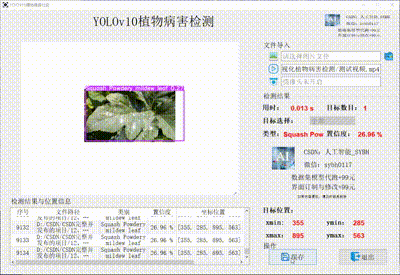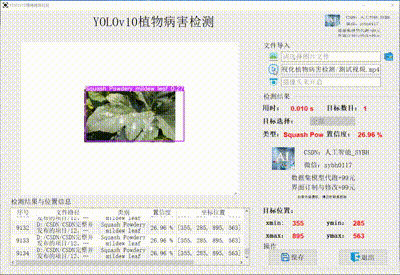 3) 实时检测与UI展示:利用摄像头实时捕捉图像输入系统,经过YOLOv10模型处理后快速识别植物病害区域,同时在用户界面上同步显示检测结果和警报信息。