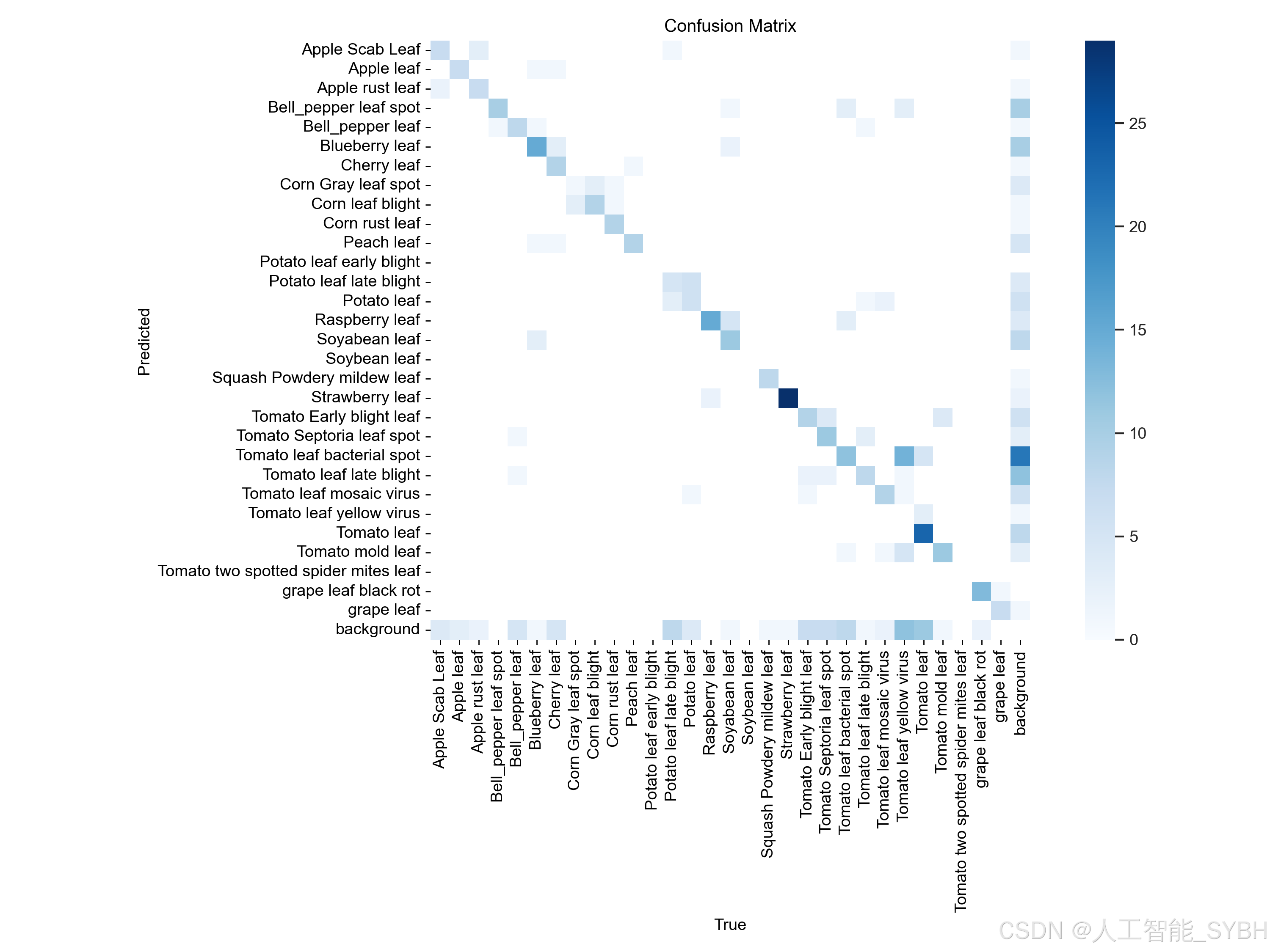 1) 数据集准备:收集并标注了大量植物病害的样本数据(30个种类),涵盖多种场景和环境。