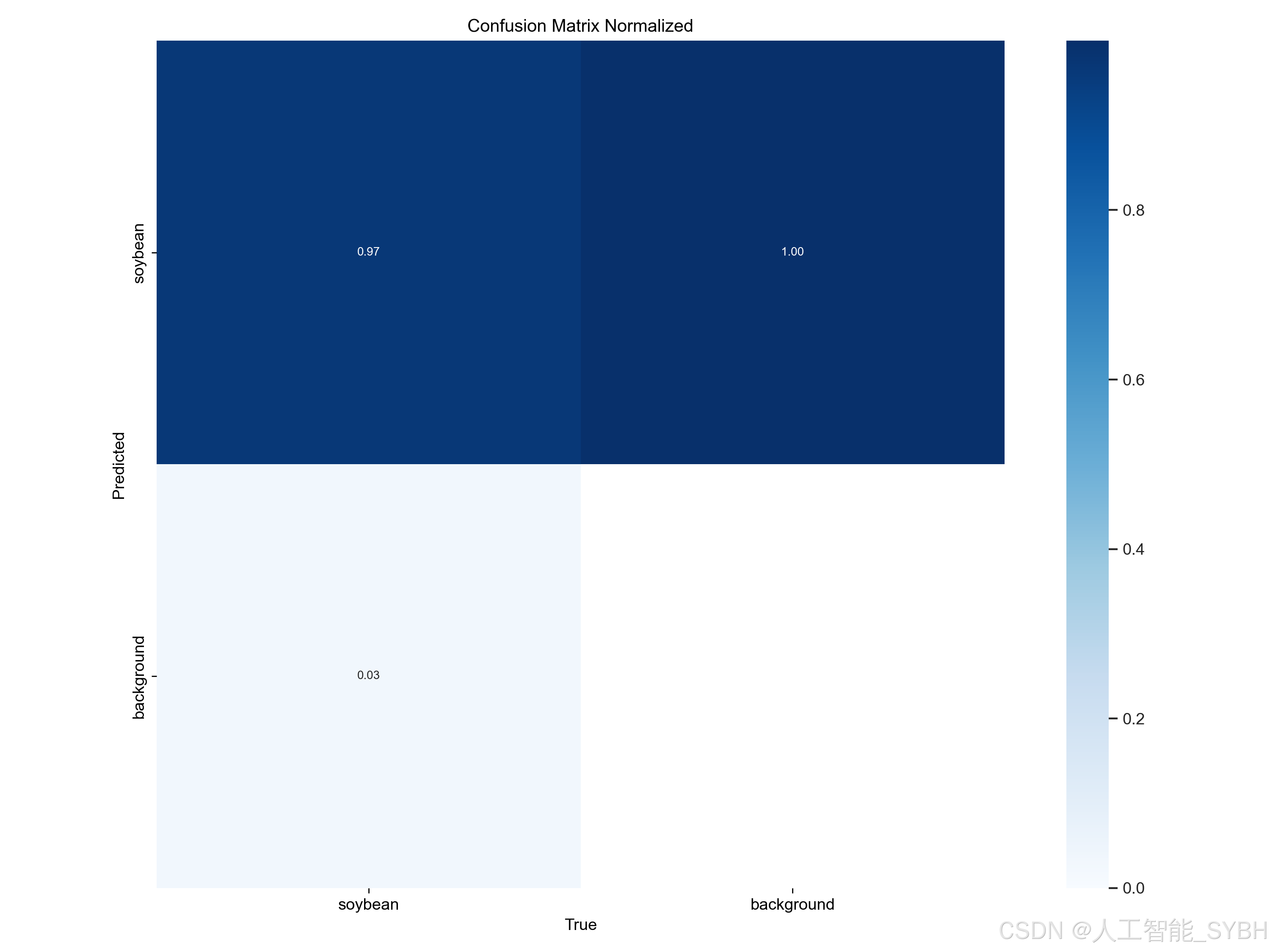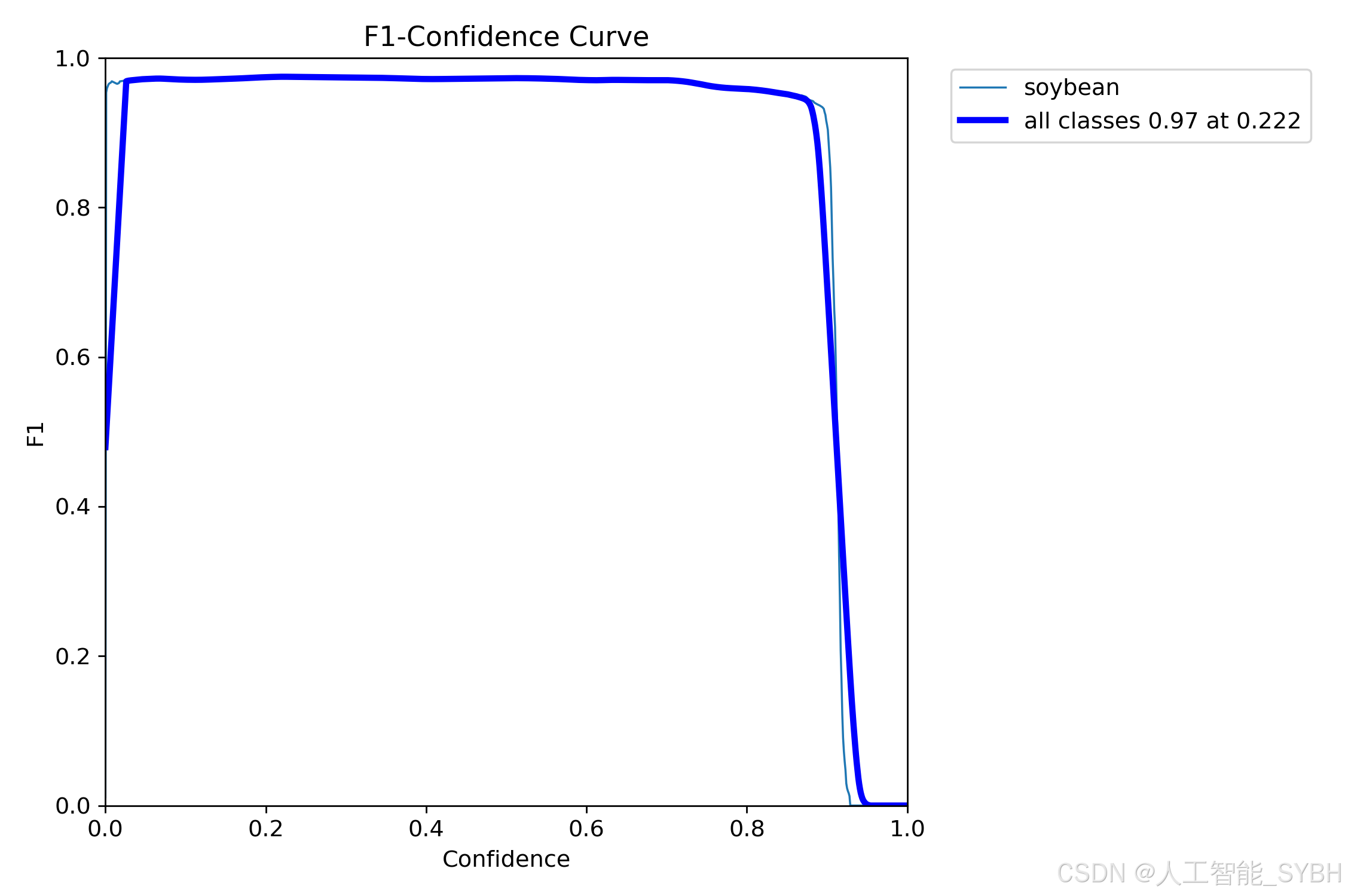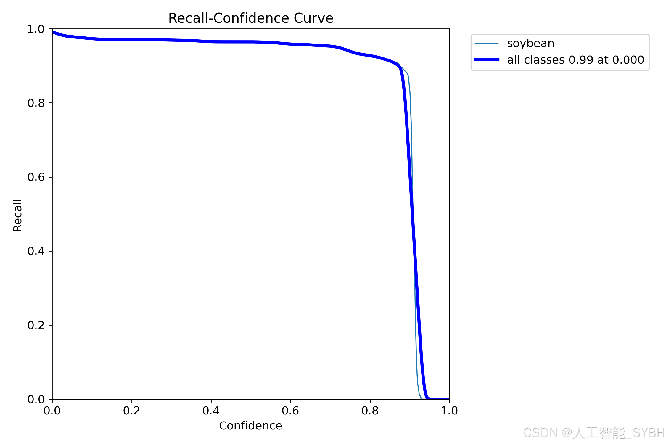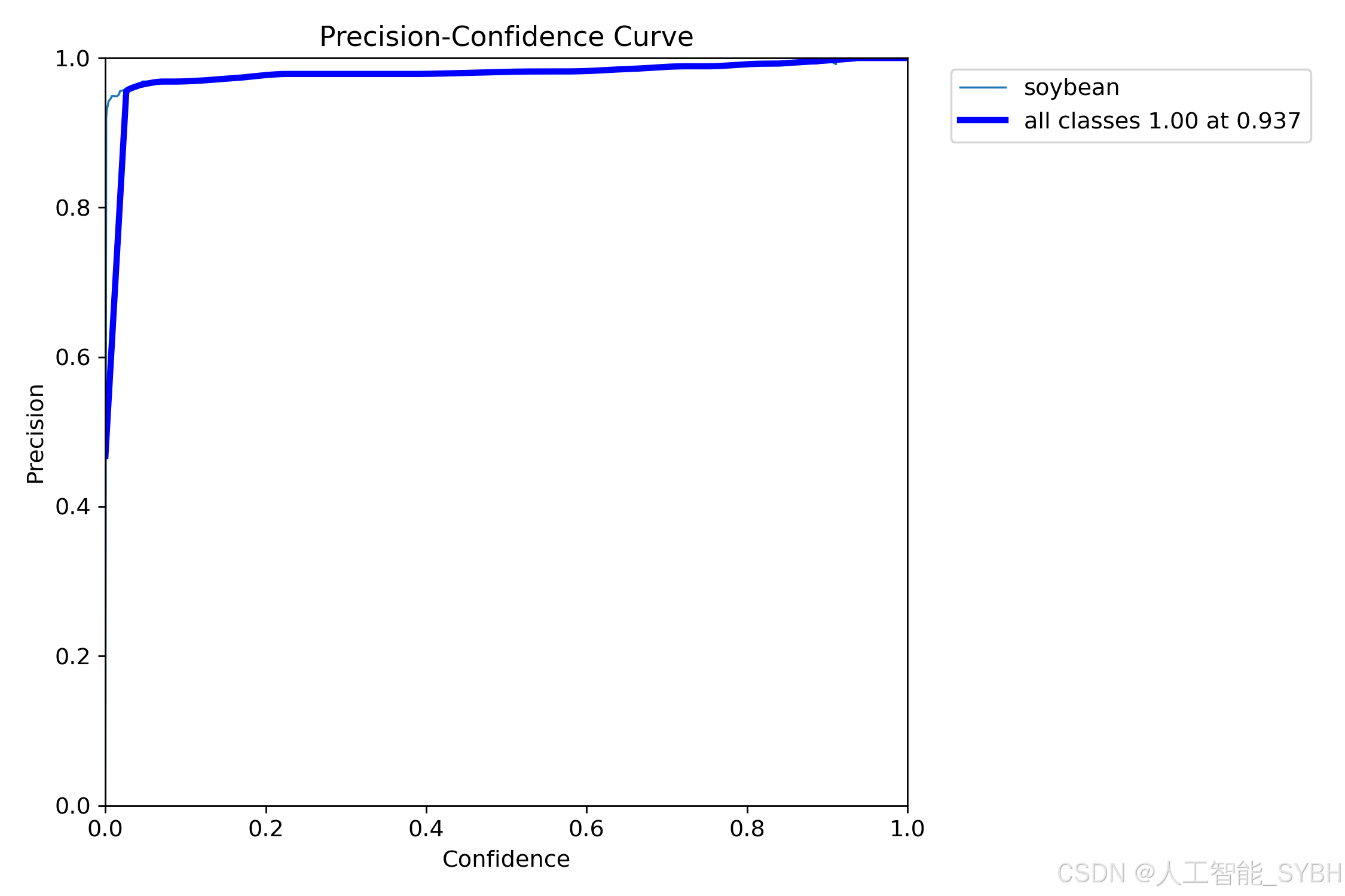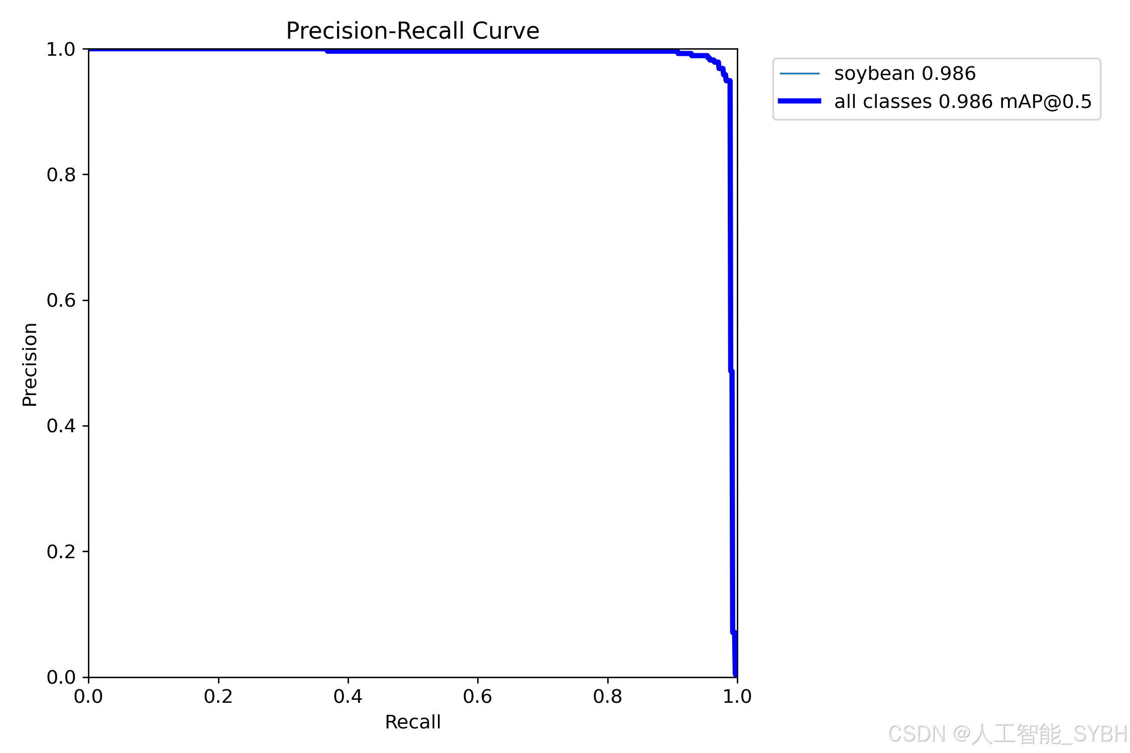 PR曲线体现精确率和召回率的关系,本文训练结果的PR曲线如下。mAP表示Precision和Recall作为两轴作图后围成的面积,m表示平均,@后面的数表示判定iou为正负样本的阈值。mAP@.5:表示阈值大于0.5的平均mAP,大豆的mAP@0.5已经达到0.986 。