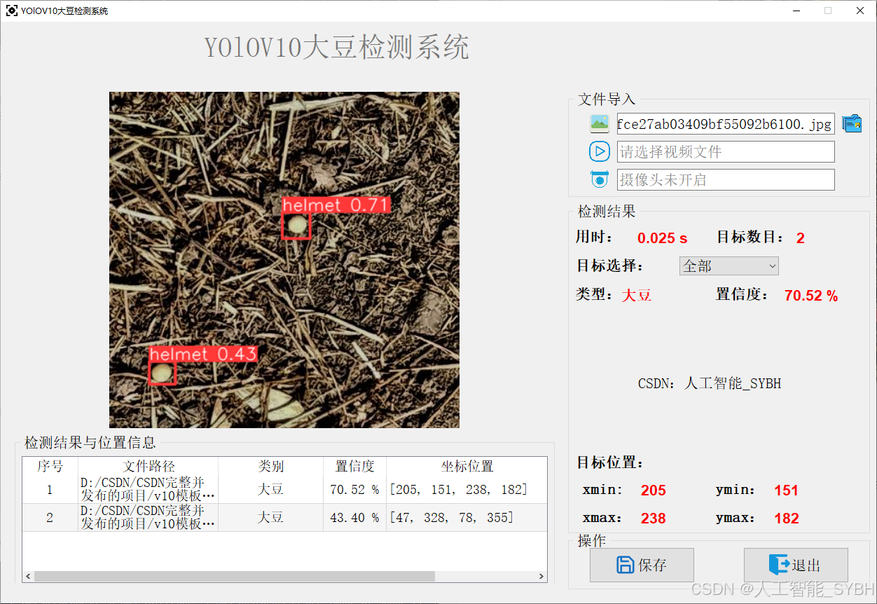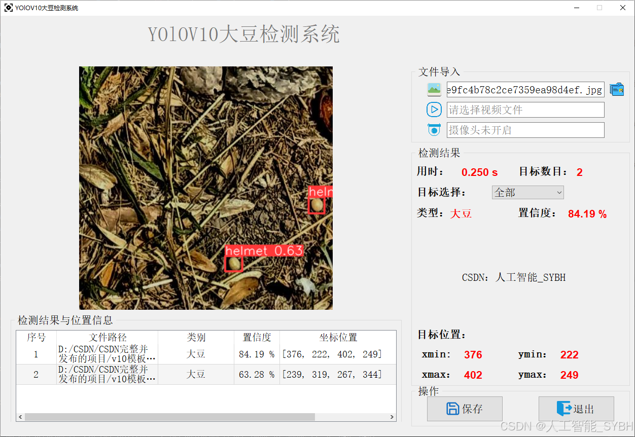 本文基于YOLOv10深度学习框架,通过2000张图片,训练了一个进行大豆的目标检测模型,准确率高达98.6%。并基于此模型开发了一款带UI界面的大豆检测系统,可用于实时检测场景中的大豆,更方便进行功能的展示。该系统是基于python与PyQT5开发的,支持图片、视频以及摄像头进行实时目标检测,并保存检测结果。