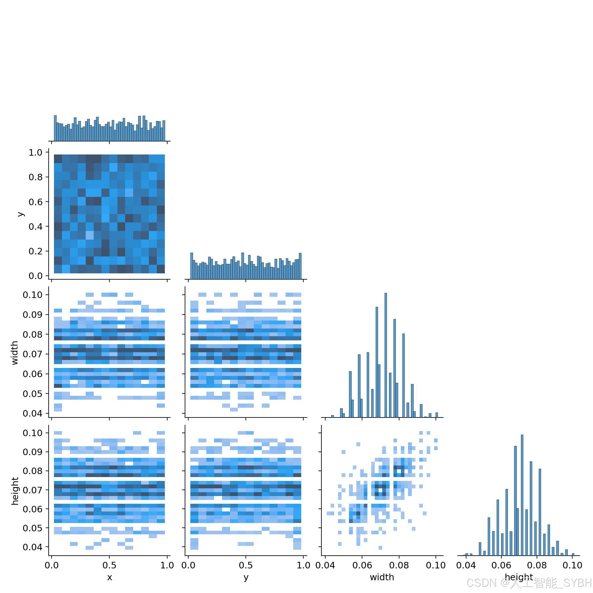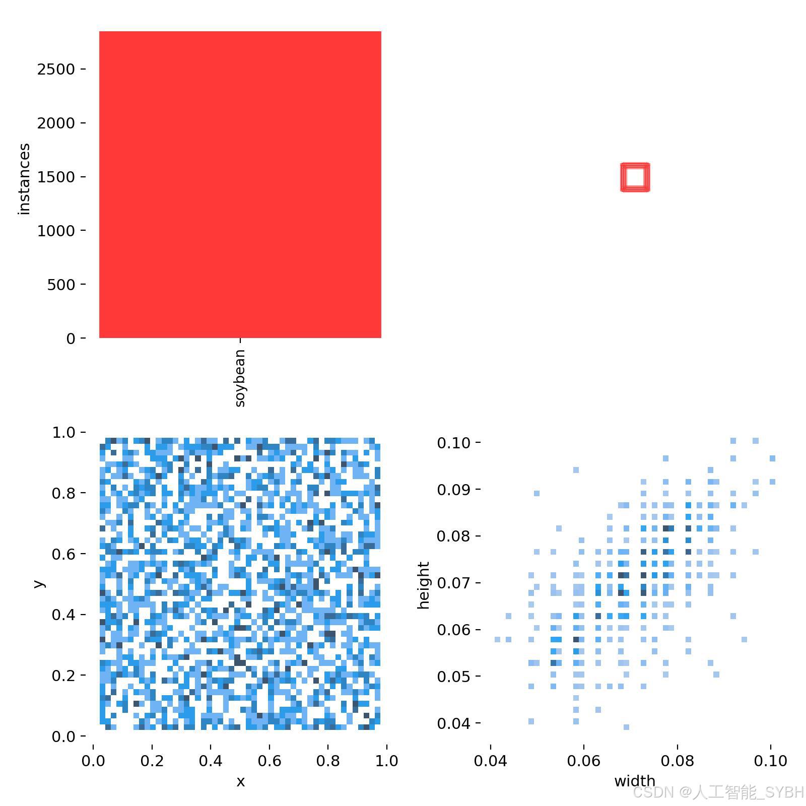 通过分析数据集的标注分布图,我们发现大部分标注框集中在图像的中心区域。这表明数据采集过程中存在一个偏向性:大豆大多出现在画面中央。虽然这种分布有助于模型更好地学习识别中心区域的目标,但也可能导致模型在检测图像边缘的大豆时表现欠佳。为此,我们采用了多种数据增强方法,包括随机旋转、缩放、裁剪以及颜色变化等,以模拟不同的视角和环境条件