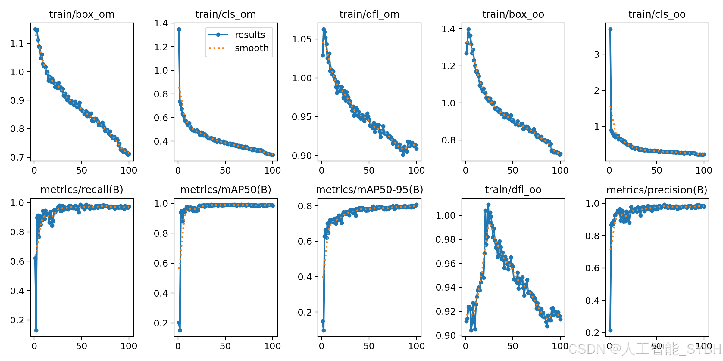 在性能指标方面,图表中的metrics/precision、metrics/recall、metrics/mAP50和metrics/mAP50-95展示了模型性能的逐步提升。随着训练迭代的增加,准确率(Precision)和召回率(Recall)不断提高,这表明模型在识别正样本时变得更加精确,且能捕捉到更多的正样本。mAP(mean Average Precision)是目标检测领域中重要的评估指标之一,其中metrics/mAP50和metrics/mAP50-95的提升说明模型在不同IoU阈值下的检测性能均在提高。具体而言,mAP50表示IoU为0.5时的平均精度,而mAP50-95则涵盖了IoU从0.5到0.95不同阈值下的平均精度,这更加全面地反映了模型在各种重叠程度下的表现。这些指标的稳步上升表明模型在整个训练过程中不断优化,性能逐渐增强。