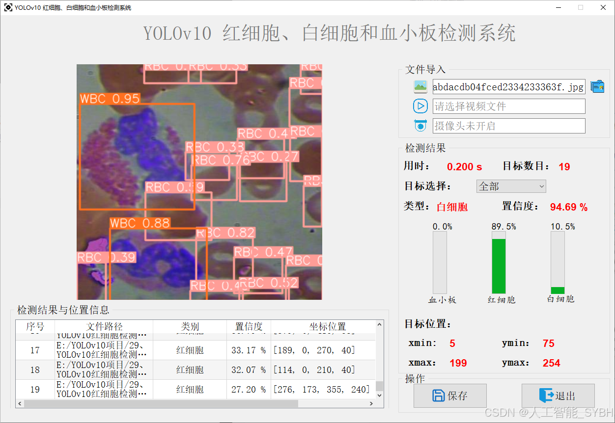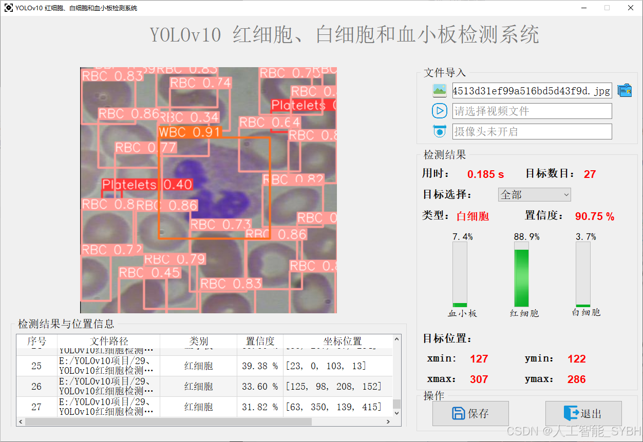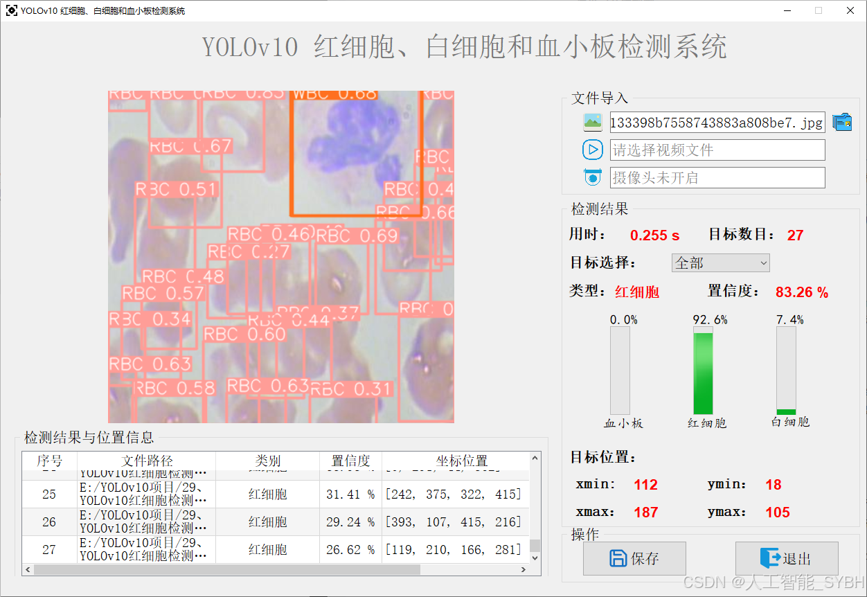 本项目旨在利用 YOLOv10 目标检测算法,构建一个高效、准确的红细胞检测系统。系统能够实时检测图像中的红细胞(RBC)、白细胞(WBC)和血小板(Platelets),并输出检测结果。通过训练和优化模型,系统能够在复杂背景下准确识别血细胞,满足医学诊断和血液分析的需求。