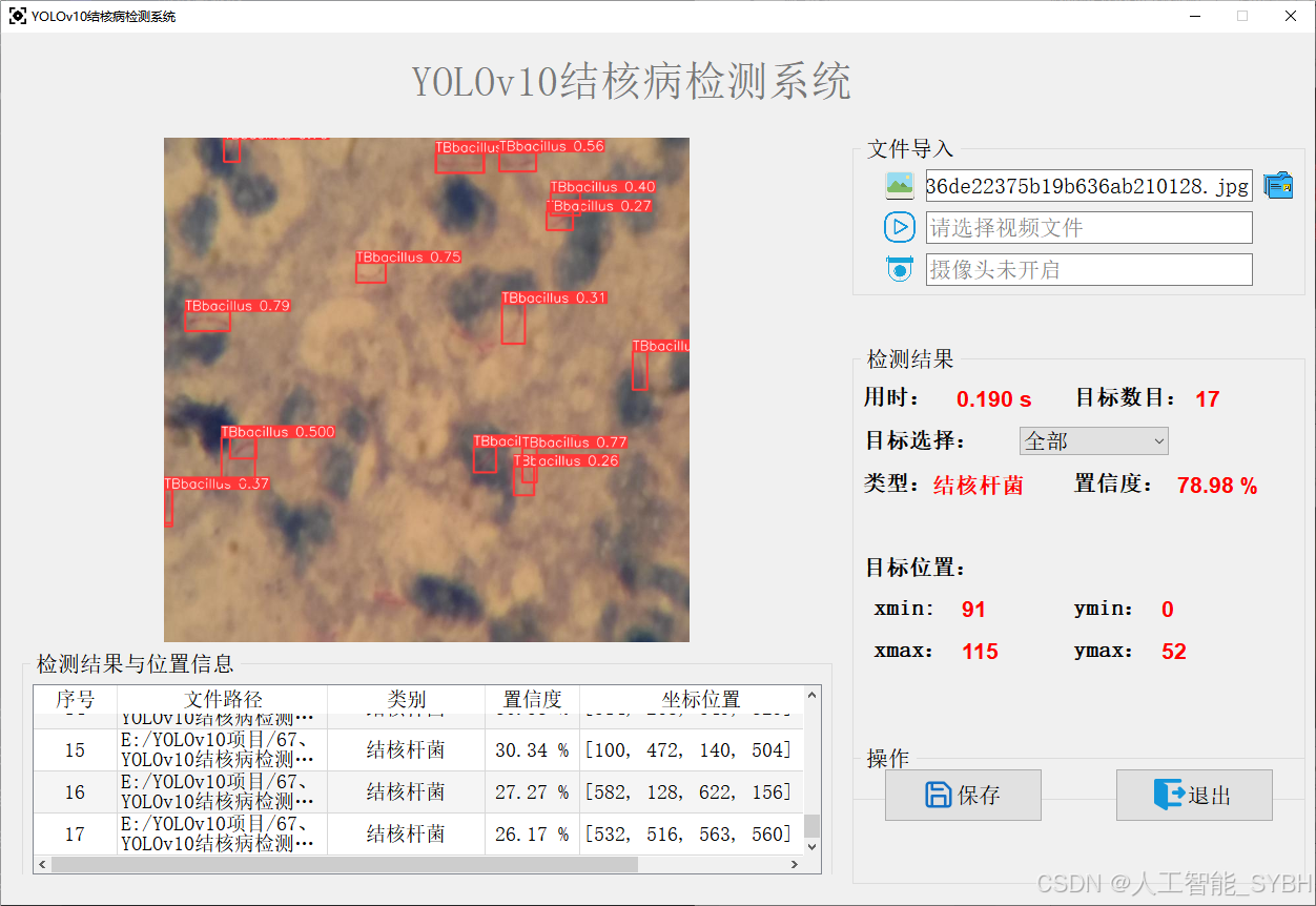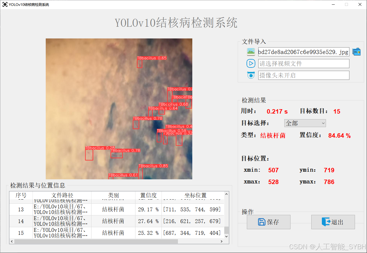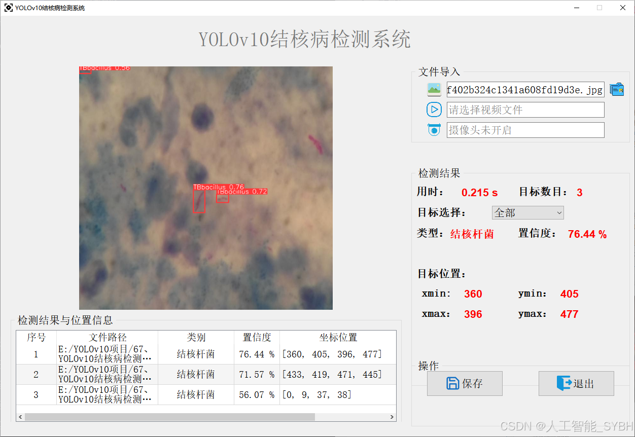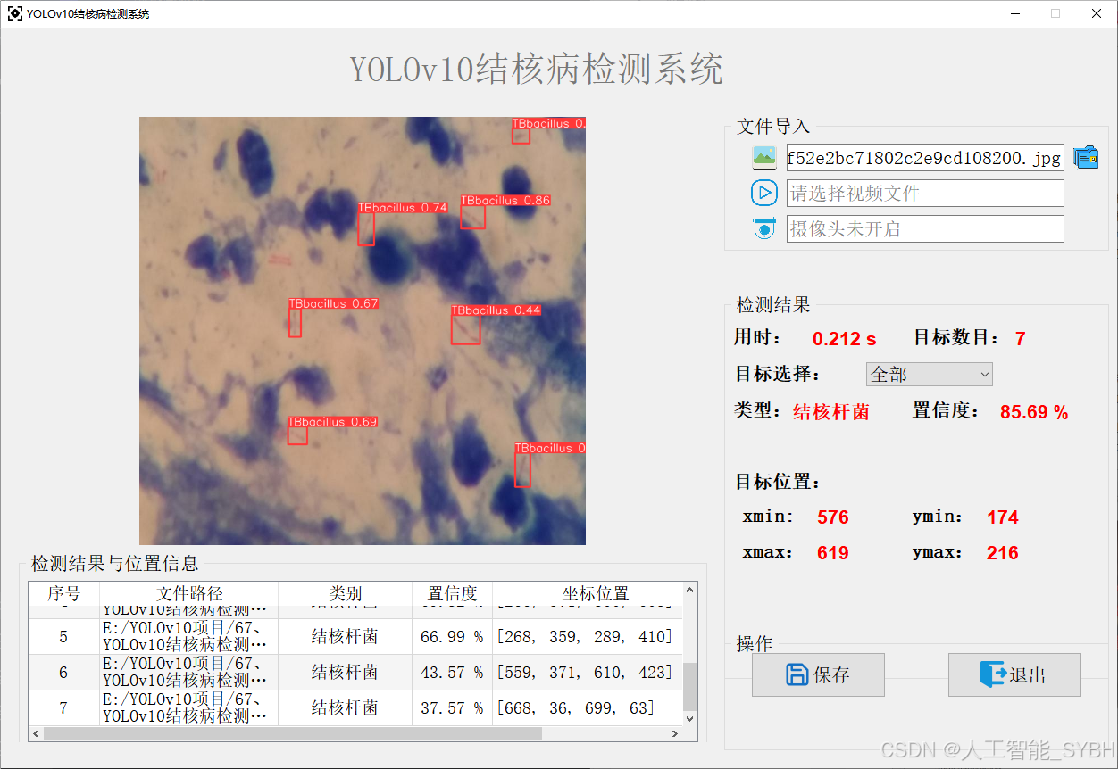 近年来,基于深度学习的目标检测技术(如YOLO系列)在医学图像分析领域取得了显著进展。YOLOv10作为YOLO系列的最新版本,具有更高的检测速度和精度,非常适合应用于结核杆菌检测场景。本项目旨在利用YOLOv10算法,结合痰液涂片图像数据,开发一套高效、准确的结核杆菌检测系统,为结核病诊断提供智能化支持。