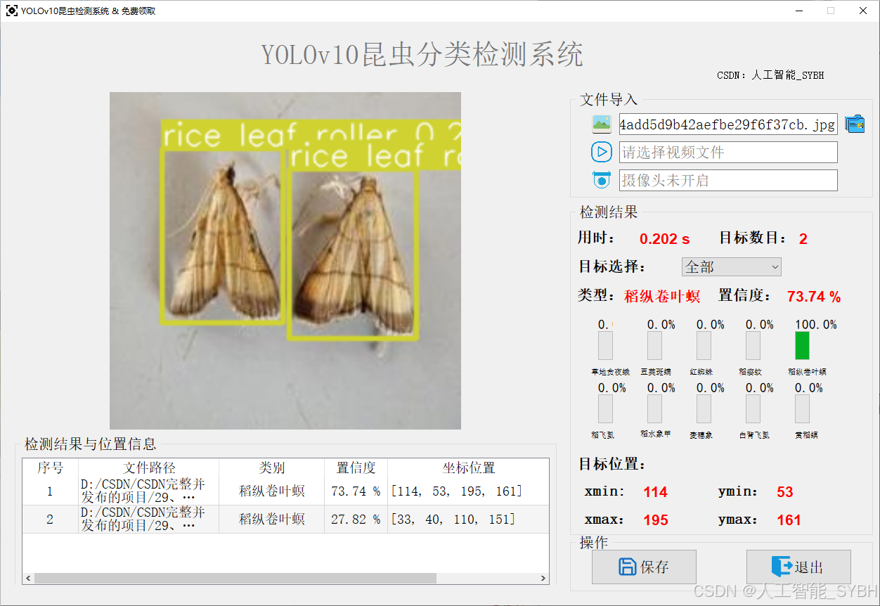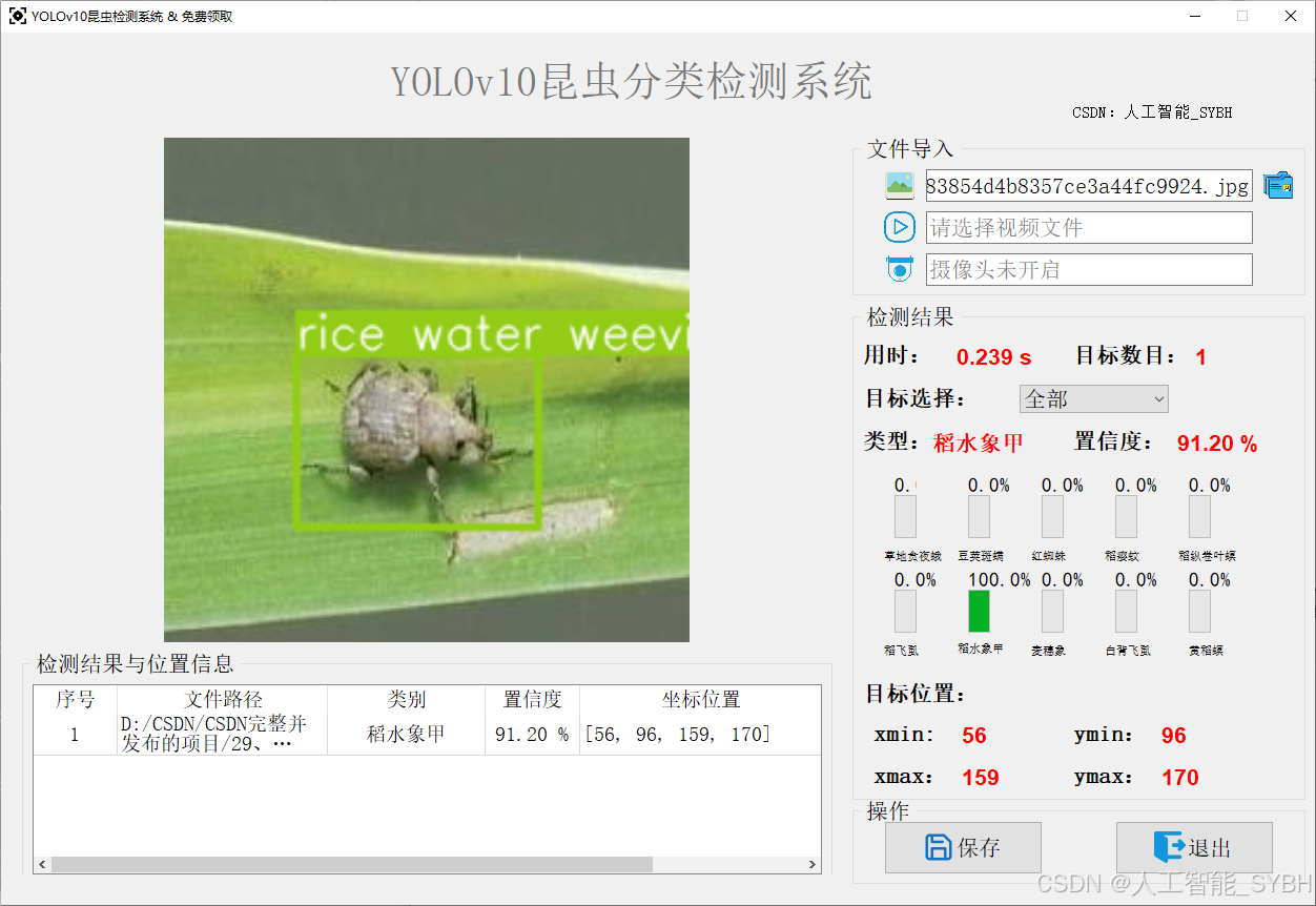 本文基于YOLOv10深度学习框架,通过1000张图片,训练了一个进行昆虫分类的目标检测模型,准确率高达89.9%。并基于此模型开发了一款带UI界面的昆虫分类检测系统,可用于实时检测场景中的昆虫,更方便进行功能的展示。该系统是基于python与PyQT5开发的,支持图片、视频以及摄像头进行实时目标检测,并保存检测结果。