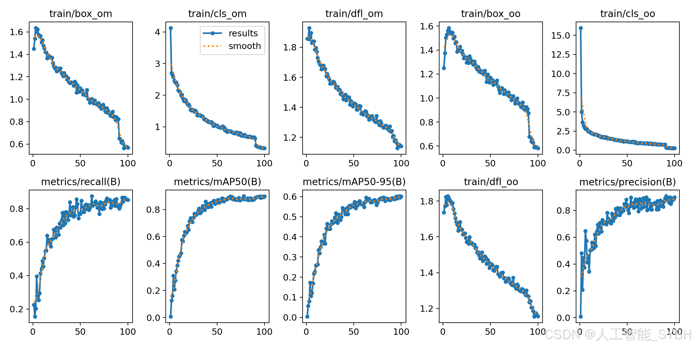 在性能指标方面,图表中的metrics/precision、metrics/recall、metrics/mAP50和metrics/mAP50-95展示了模型性能的逐步提升。随着训练迭代的增加,准确率(Precision)和召回率(Recall)不断提高,这表明模型在识别正样本时变得更加精确,且能捕捉到更多的正样本。mAP(mean Average Precision)是目标检测领域中重要的评估指标之一,其中metrics/mAP50和metrics/mAP50-95的提升说明模型在不同IoU阈值下的检测性能均在提高。具体而言,mAP50表示IoU为0.5时的平均精度,而mAP50-95则涵盖了IoU从0.5到0.95不同阈值下的平均精度,这更加全面地反映了模型在各种重叠程度下的表现。这些指标的稳步上升表明模型在整个训练过程中不断优化,性能逐渐增强。