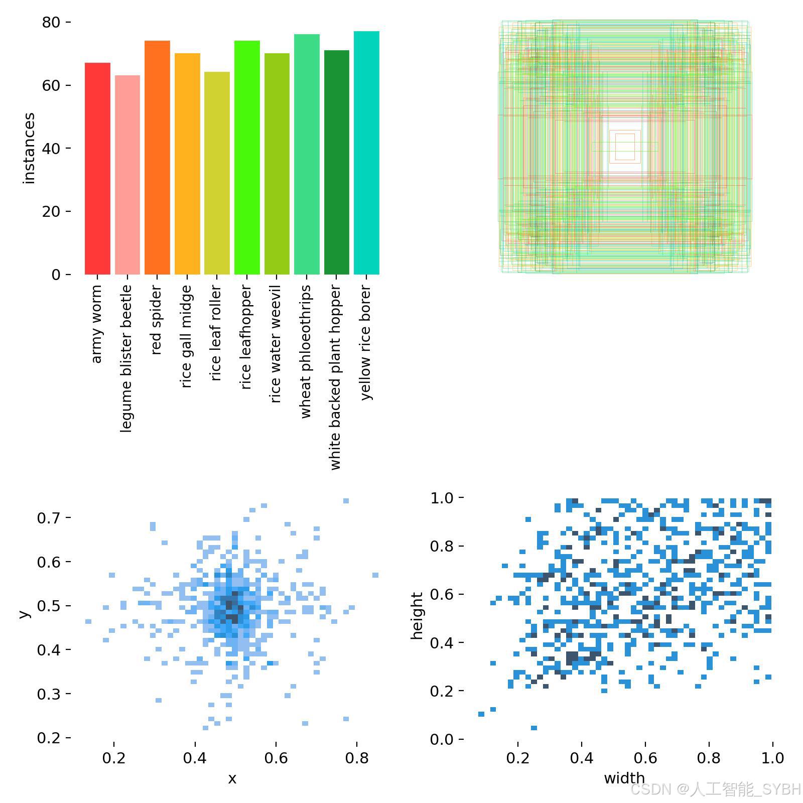 通过分析数据集的标注分布图,我们发现大部分标注框集中在图像的中心区域。这表明数据采集过程中存在一个偏向性:昆虫大多出现在画面中央。虽然这种分布有助于模型更好地学习识别中心区域的目标,但也可能导致模型在检测图像边缘的昆虫时表现欠佳。为此,我们采用了多种数据增强方法,包括随机旋转、缩放、裁剪以及颜色变化等,以模拟不同的视角和环境条件,从而提升模型在各种情况下对烟雾的检测能力。