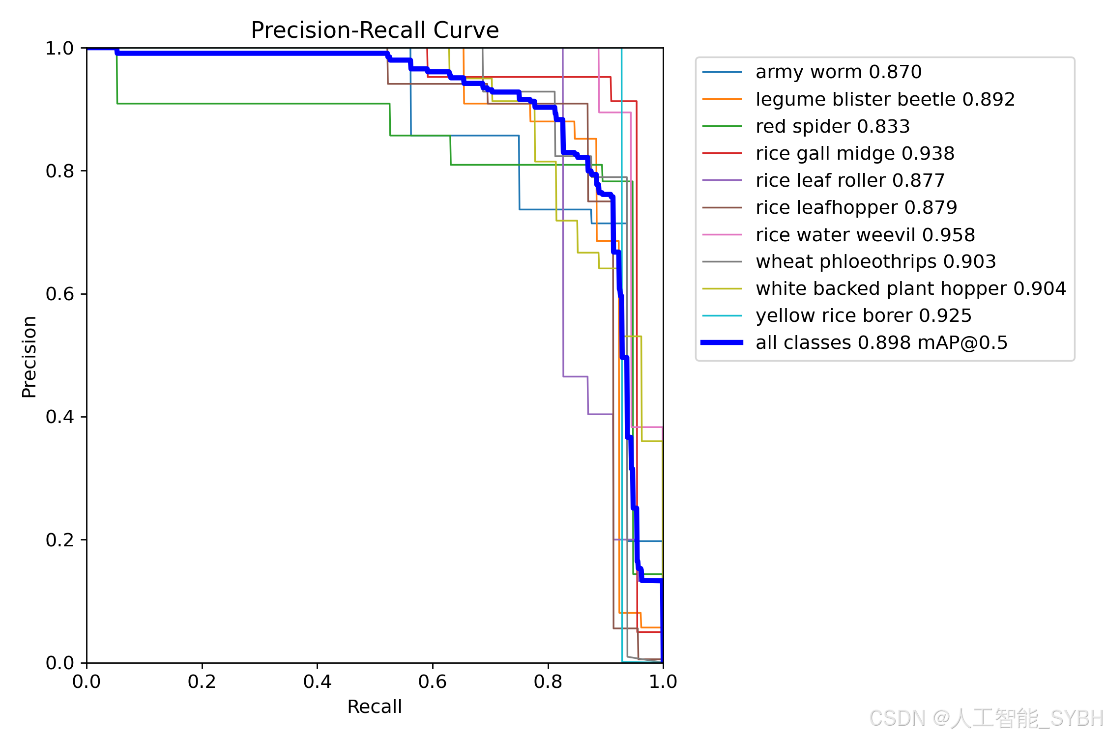 PR曲线体现精确率和召回率的关系,本文训练结果的PR曲线如下。mAP表示Precision和Recall作为两轴作图后围成的面积,m表示平均,@后面的数表示判定iou为正负样本的阈值。mAP@.5:表示阈值大于0.5的平均mAP,平均值为0.898 。