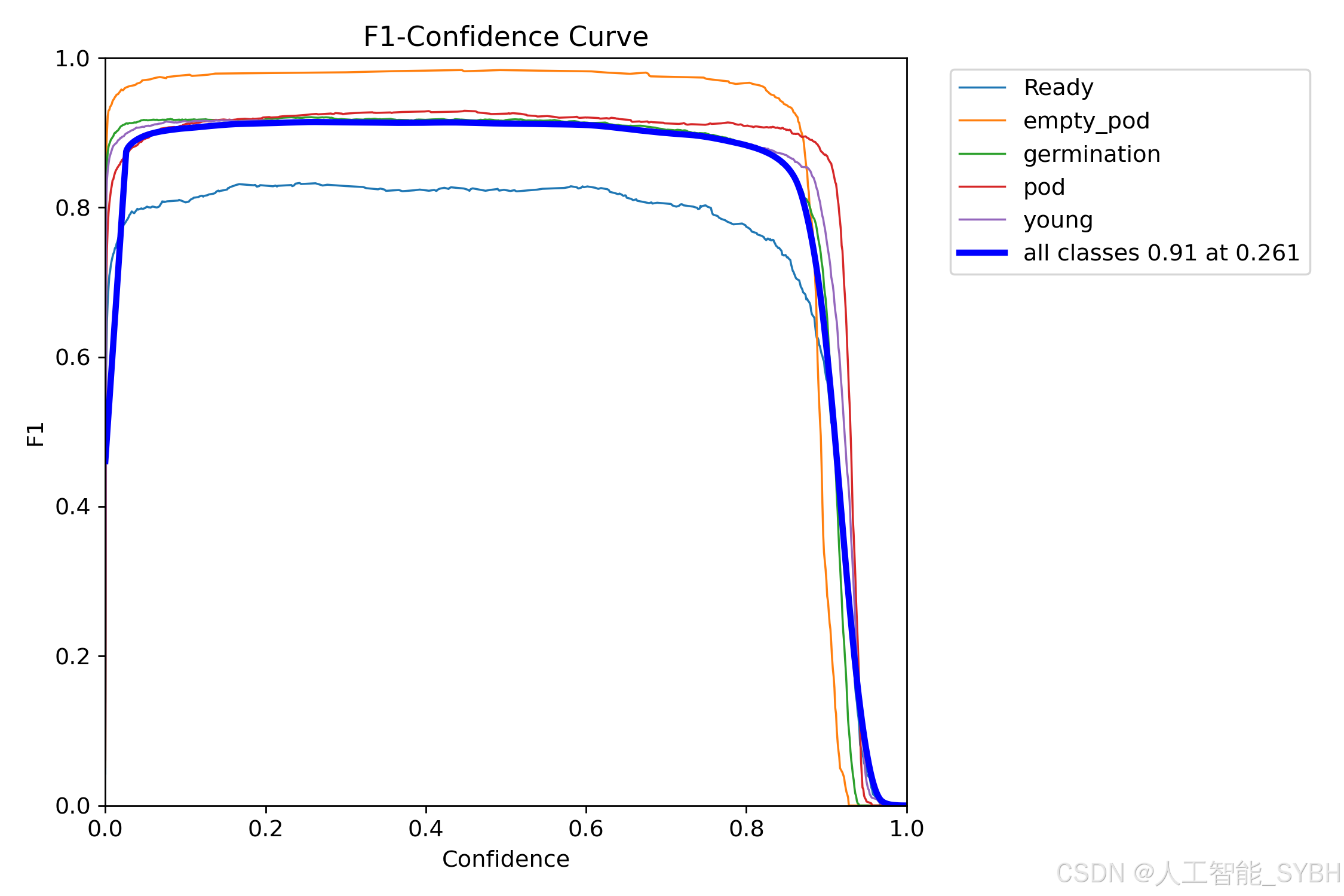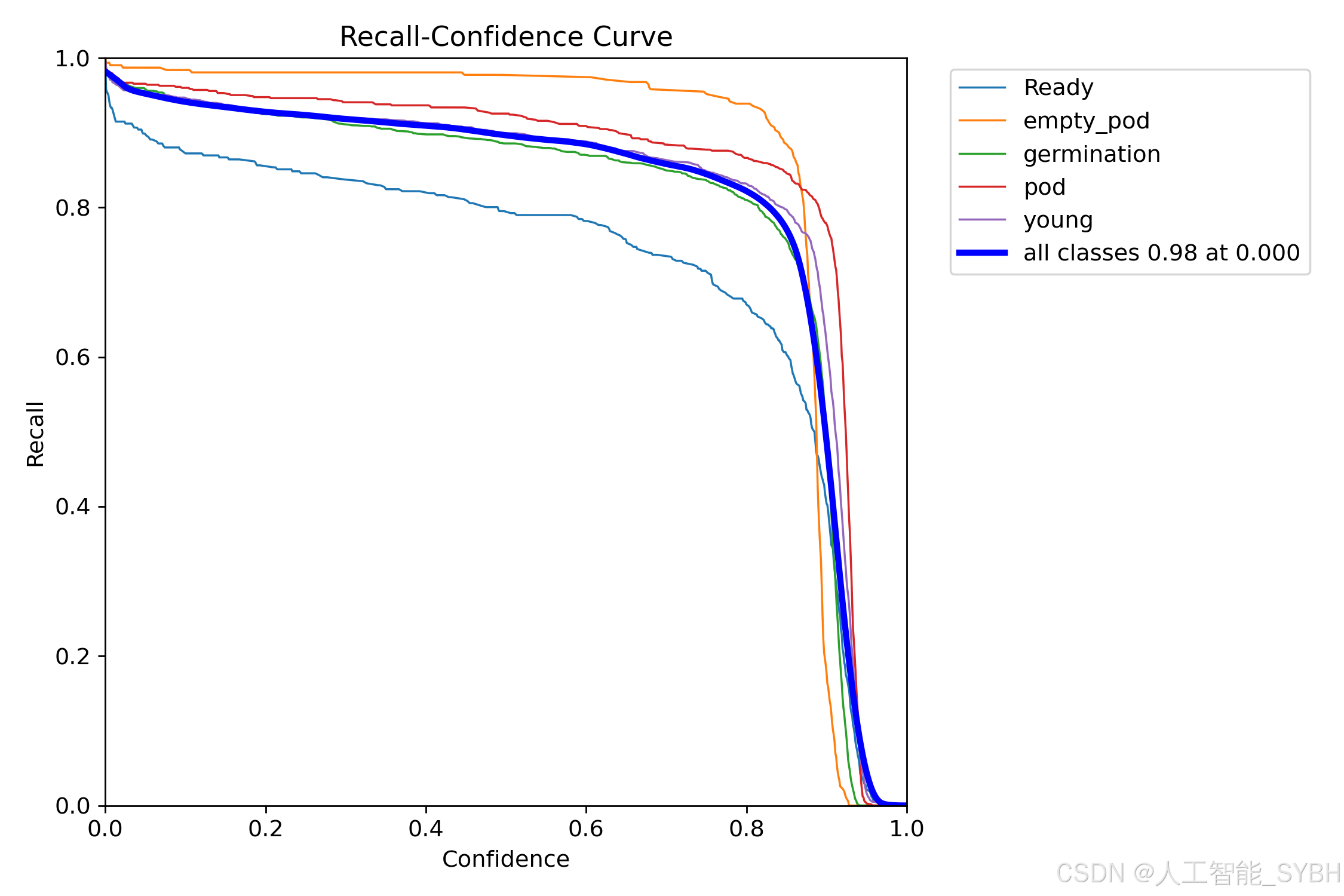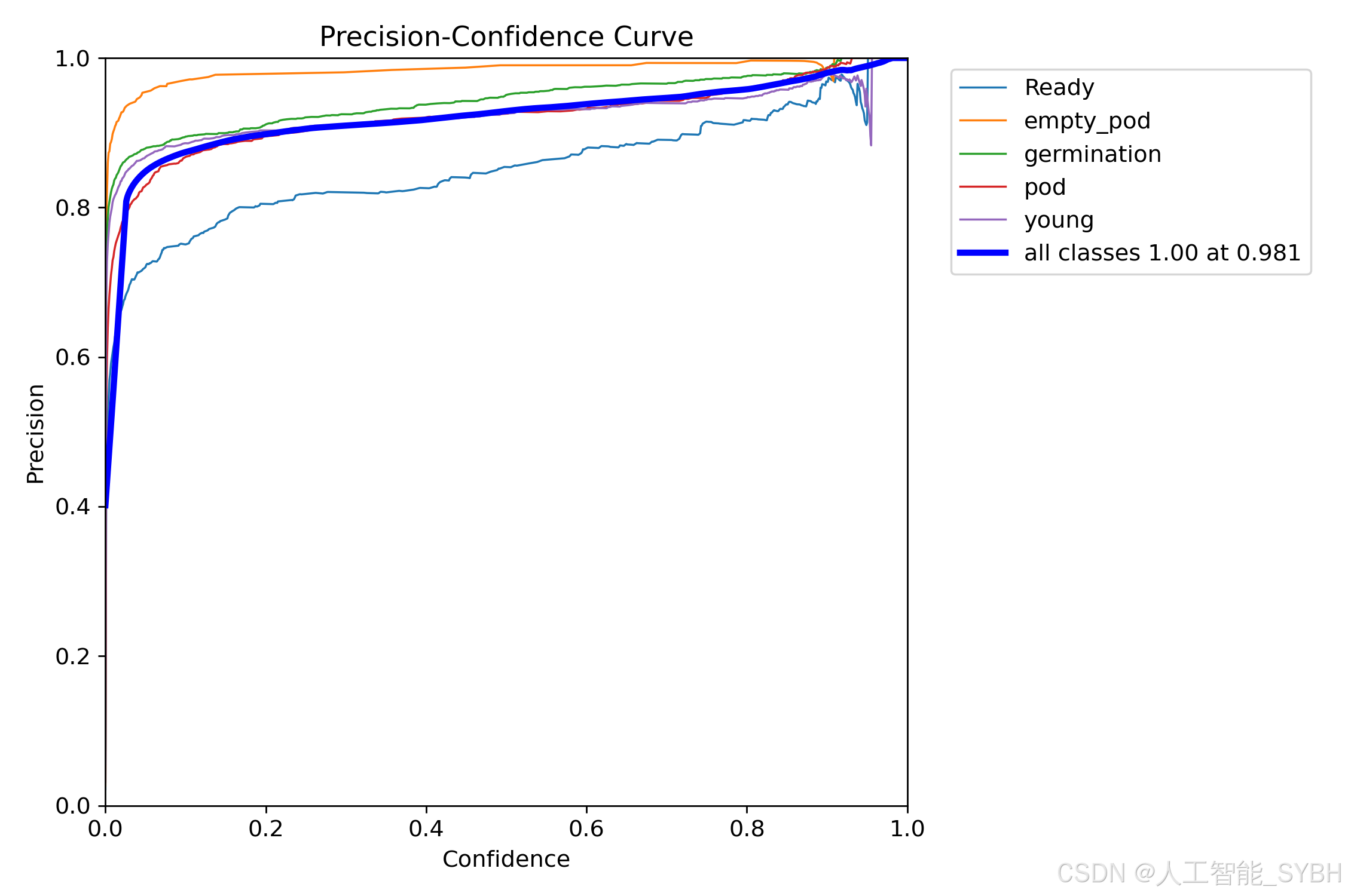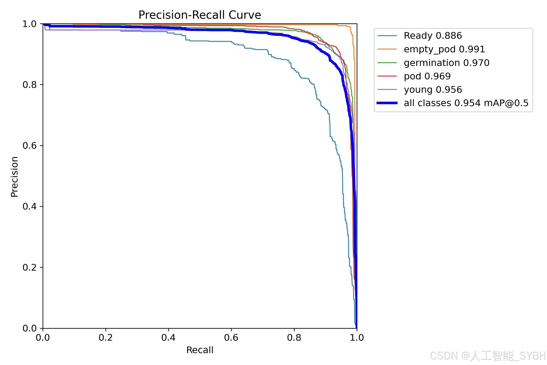 PR曲线体现精确率和召回率的关系,本文训练结果的PR曲线如下。mAP表示Precision和Recall作为两轴作图后围成的面积,m表示平均,@后面的数表示判定iou为正负样本的阈值。mAP@.5:表示阈值大于0.5的平均mAP,平均的mAP@0.5已经达到0.954。