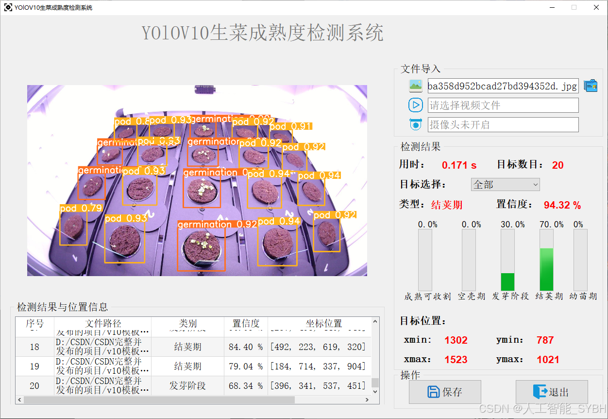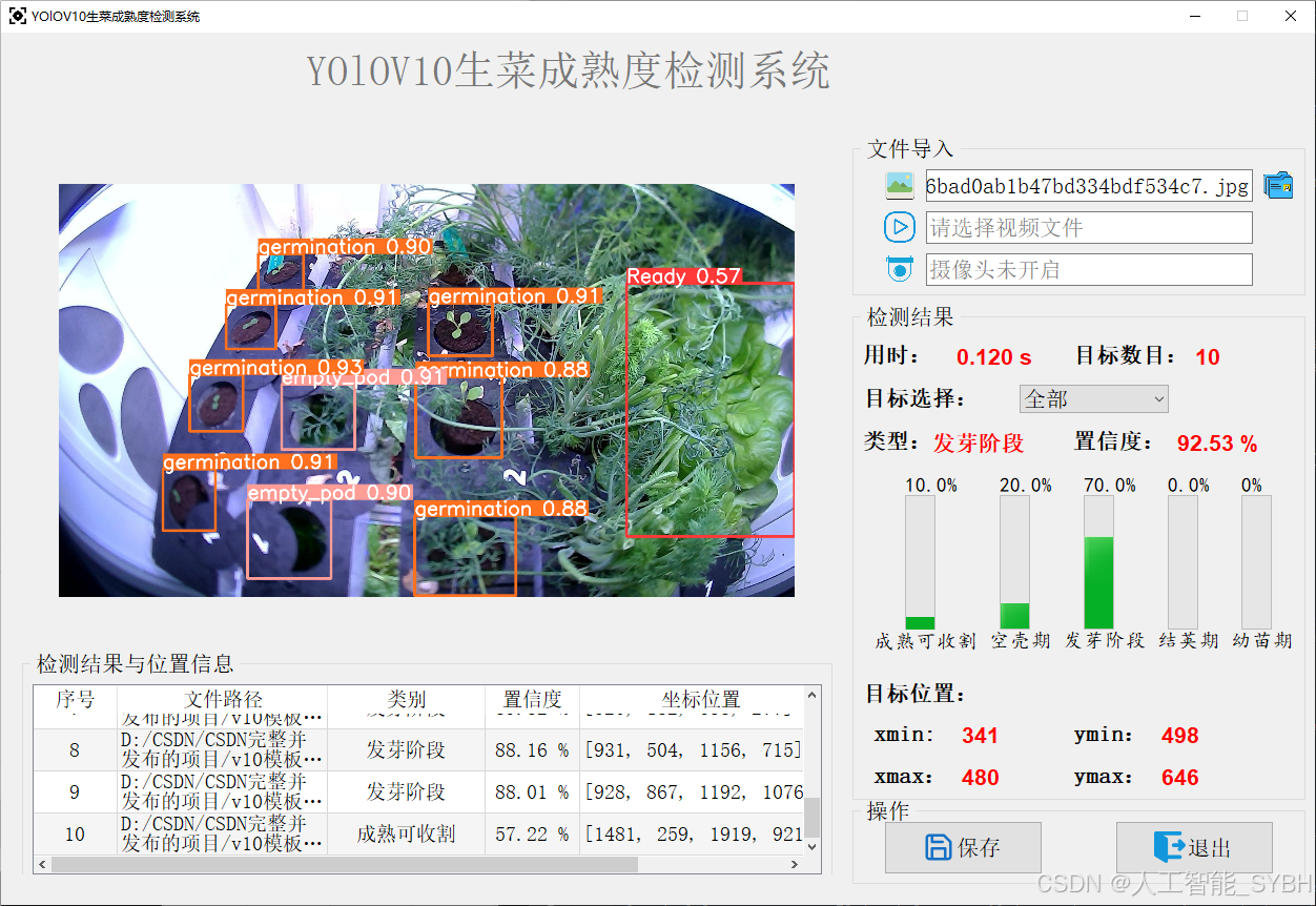 本文基于YOLOv10深度学习框架,通过1510张图片,训练了一个进行生菜生长周期的目标检测模型,准确率高达95.4%。并基于此模型开发了一款带UI界面的生菜生长周期检测系统,可用于实时检测场景中的生菜生长周期,更方便进行功能的展示。该系统是基于python与PyQT5开发的,支持图片、视频以及摄像头进行实时目标检测,并保存检测结果。