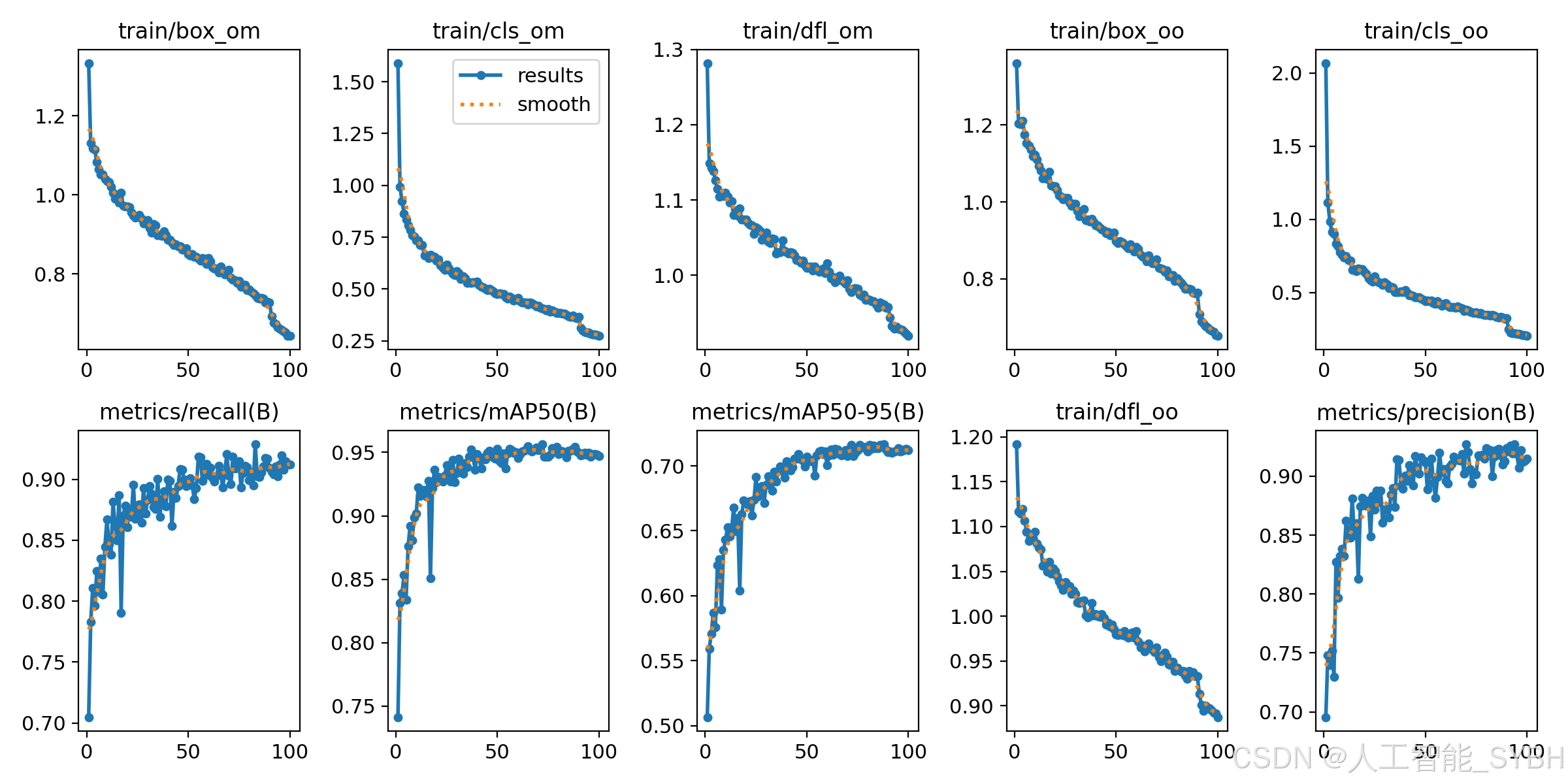 在性能指标方面,图表中的metrics/precision、metrics/recall、metrics/mAP50和metrics/mAP50-95展示了模型性能的逐步提升。随着训练迭代的增加,准确率(Precision)和召回率(Recall)不断提高,这表明模型在识别正样本时变得更加精确,且能捕捉到更多的正样本。mAP(mean Average Precision)是目标检测领域中重要的评估指标之一,其中metrics/mAP50和metrics/mAP50-95的提升说明模型在不同IoU阈值下的检测性能均在提高。具体而言,mAP50表示IoU为0.5时的平均精度,而mAP50-95则涵盖了IoU从0.5到0.95不同阈值下的平均精度,这更加全面地反映了模型在各种重叠程度下的表现。这些指标的稳步上升表明模型在整个训练过程中不断优化,性能逐渐增强。