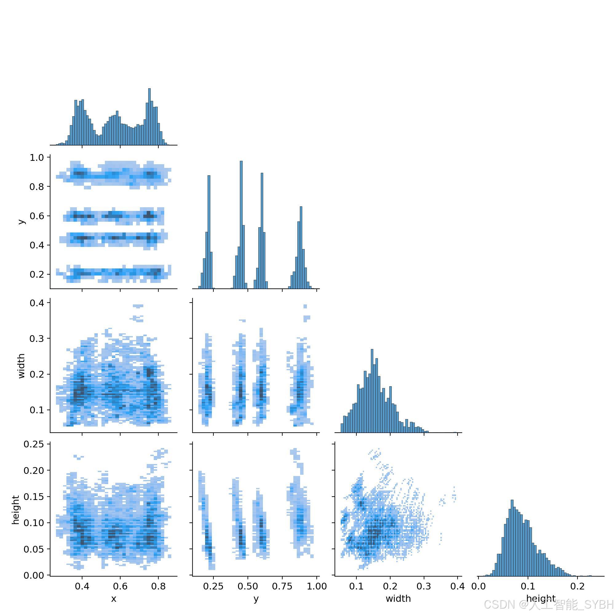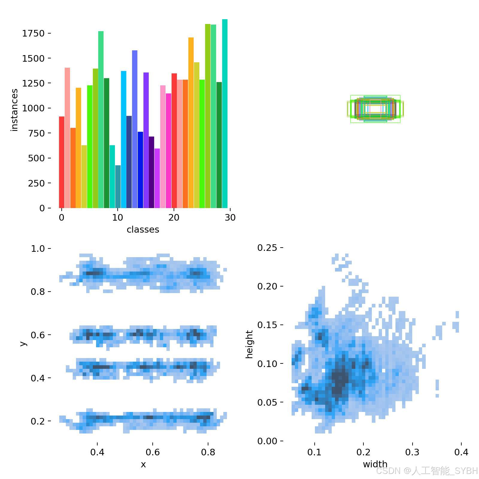 通过分析数据集的标注分布图,我们发现大部分标注框集中在图像的中心区域。这表明数据采集过程中存在一个偏向性:大多出现在画面中央。虽然这种分布有助于模型更好地学习识别中心区域的目标,但也可能导致模型在检测图像边缘时表现欠佳。为此,我们采用了多种数据增强方法,包括随机旋转、缩放、裁剪以及颜色变化等,以模拟不同的视角和环境条件,从而提升模型在各种情况下检测能力。